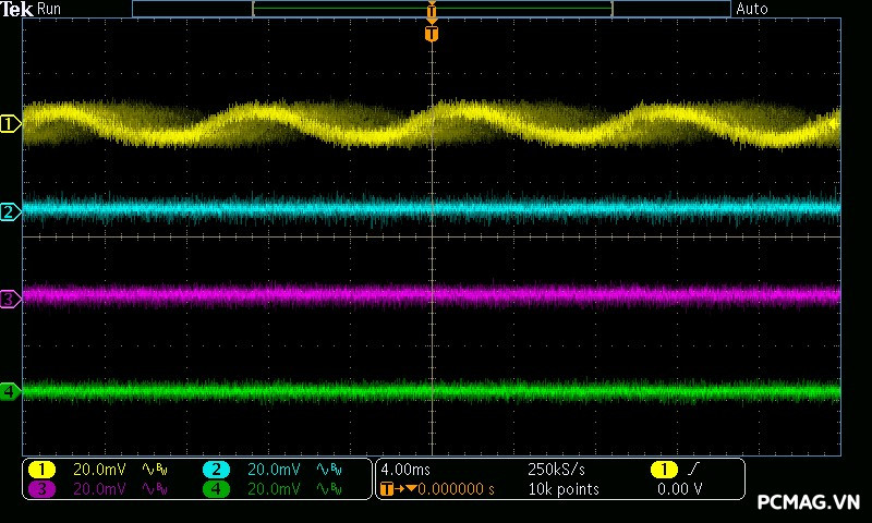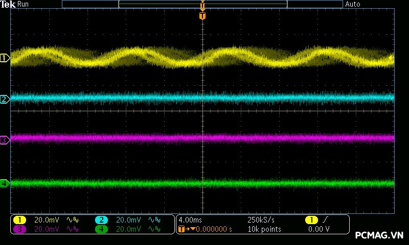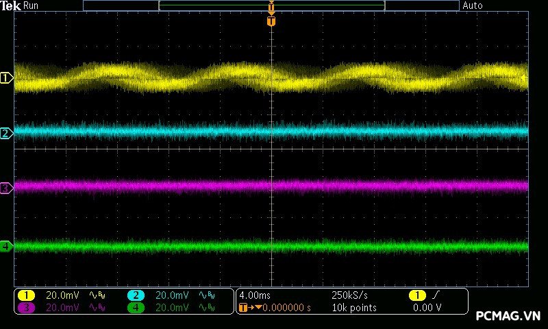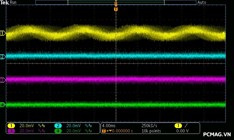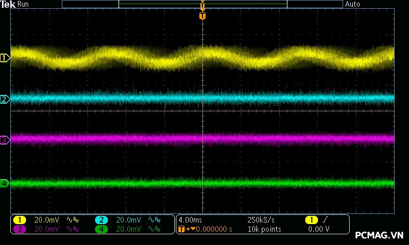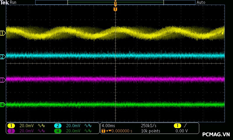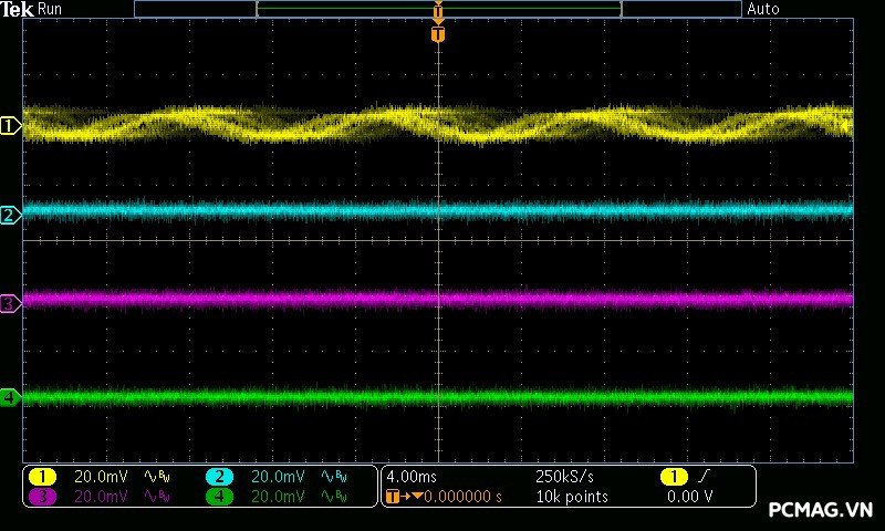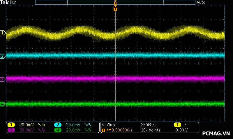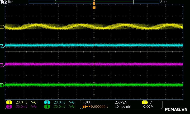 Mức nhiễu cao tần (Ripple & Noise) của NGDP Platinum 1000W ATX3.1/PCIe5.1 được kiểm soát rất tốt. Trong quá trình thử nghiệm, đường 12V ghi nhận biên độ nhiễu chỉ khoảng ±20mV, trong khi các đường điện còn lại duy trì ở mức khoảng ±15mV.