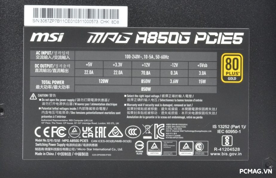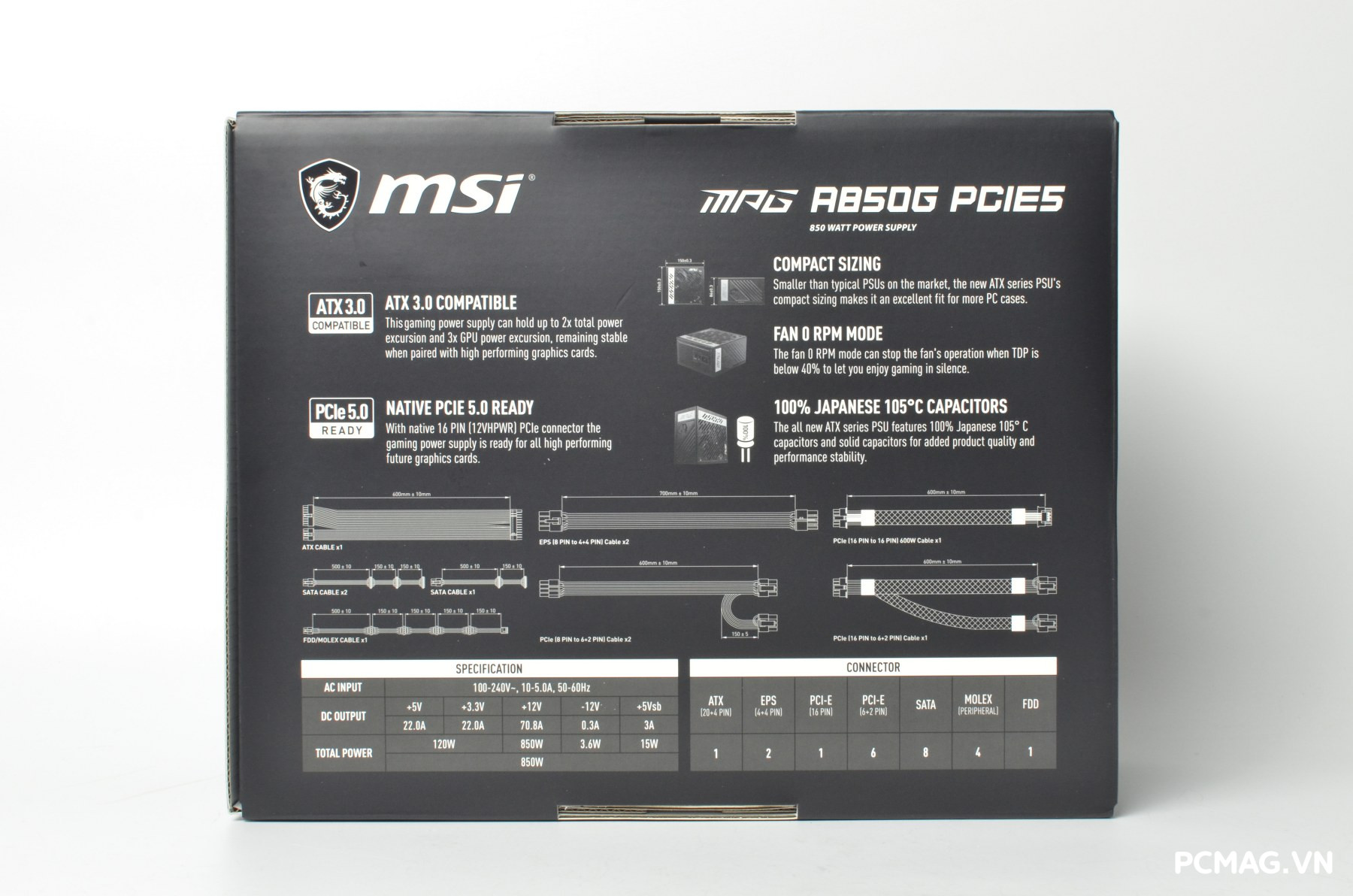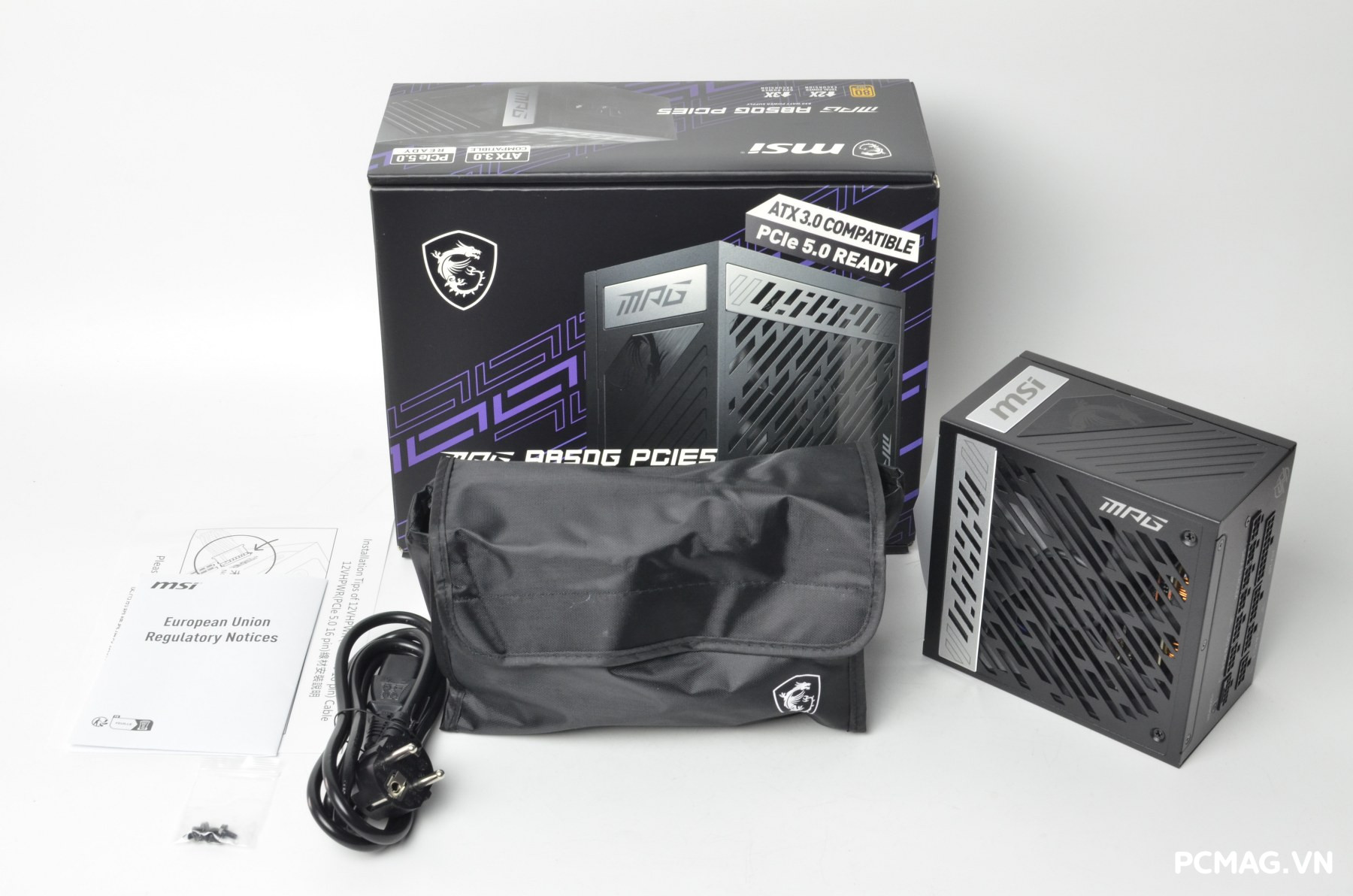 Tại PCMAG, MSI MPG A850G 850W được đánh giá là lựa chọn cao cấp nhờ sở hữu loạt trang bị đáng giá như chứng nhận 80 Plus Gold, Active PFC full-range, sử dụng 100% tụ điện Nhật Bản cho độ bền và độ ổn định cao. Bộ nguồn còn được thiết kế full modular (cáp rời hoàn toàn) giúp tối ưu đi dây, cùng chế độ semi-fanless sử dụng quạt FDB bền bỉ, vận hành êm ái.
