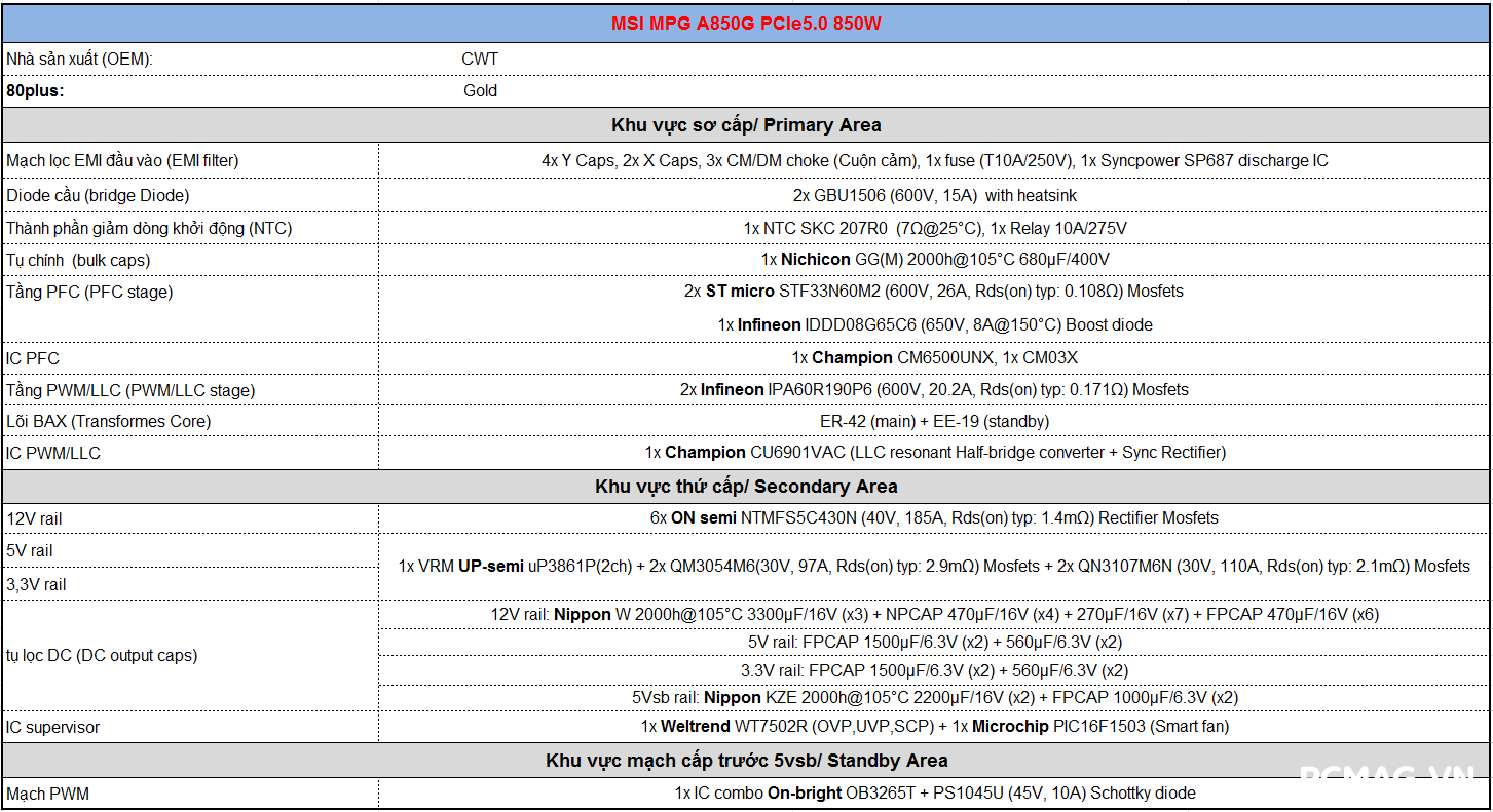 Bảng linh kiện được sử dụng trên MPG A850G ATX3.0/PCIe 5.0