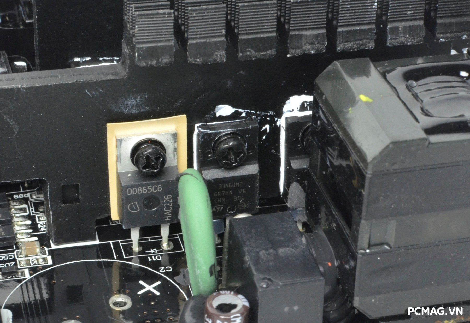 Tầng PFC được trang bị cặp MOSFET STF33N60M2 (26A) đến từ STMicroelectronics, đảm nhiệm vai trò nâng cao hiệu suất và ổn định điện áp đầu vào. Đi kèm là diode xung Infineon IDDD08G65C6 (8A @150°C), hỗ trợ hoạt động chuyển mạch hiệu quả và giảm tổn hao năng lượng.