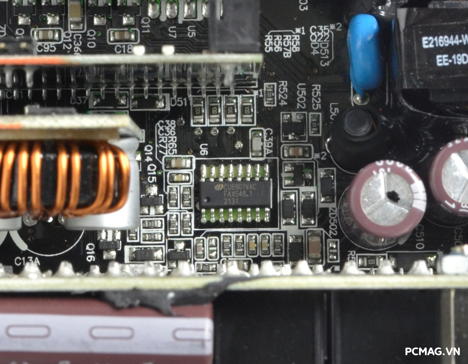 IC giám sát WT7502R đảm nhiệm việc theo dõi hoạt động của toàn bộ hệ thống, cung cấp các cơ chế bảo vệ quan trọng như OVP (quá áp), UVP (thấp áp) và SCP (ngắn mạch). Ngay bên cạnh là vi điều khiển PIC16F1503, được lập trình để quản lý và điều khiển chế độ hoạt động của quạt làm mát, giúp cân bằng giữa hiệu suất và độ ồn.
