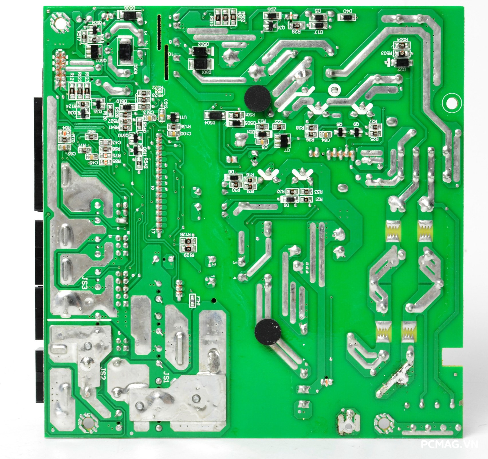 Do phần lớn linh kiện, bao gồm cả các linh kiện SMD, đều được bố trí và hàn ở mặt trên, nên mặt dưới của bo mạch khá gọn gàng và thông thoáng. Các mối hàn được hoàn thiện sạch sẽ, sáng bóng, không xuất hiện chân linh kiện thừa, thể hiện chất lượng gia công cao và độ hoàn thiện tốt của sản phẩm.