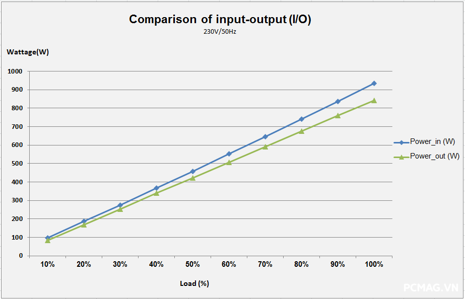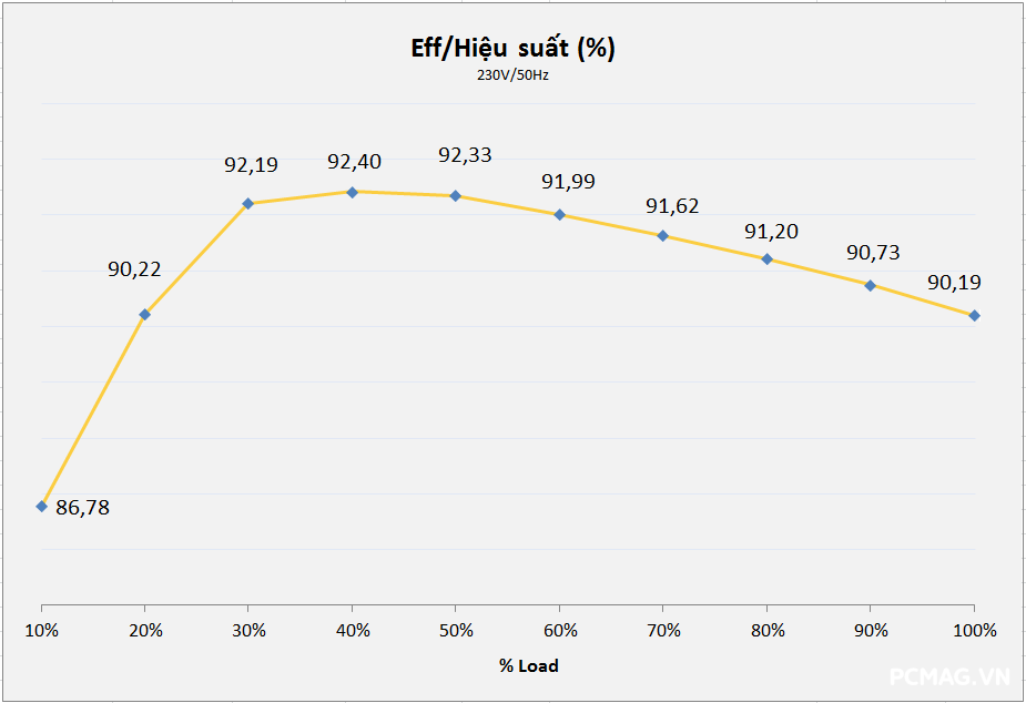 MSI MPG A850G 850W ATX 3.0 / PCIe 5.0 vượt qua các bài kiểm tra tải với độ ổn định cao, điện áp dao động ở mức rất thấp và luôn nằm trong ngưỡng tiêu chuẩn ATX. Hiệu suất đạt khoảng 92% tại điện áp 230V AC, đáp ứng đầy đủ chứng nhận 80 Plus Gold, đảm bảo khả năng vận hành hiệu quả và tiết kiệm điện năng.
