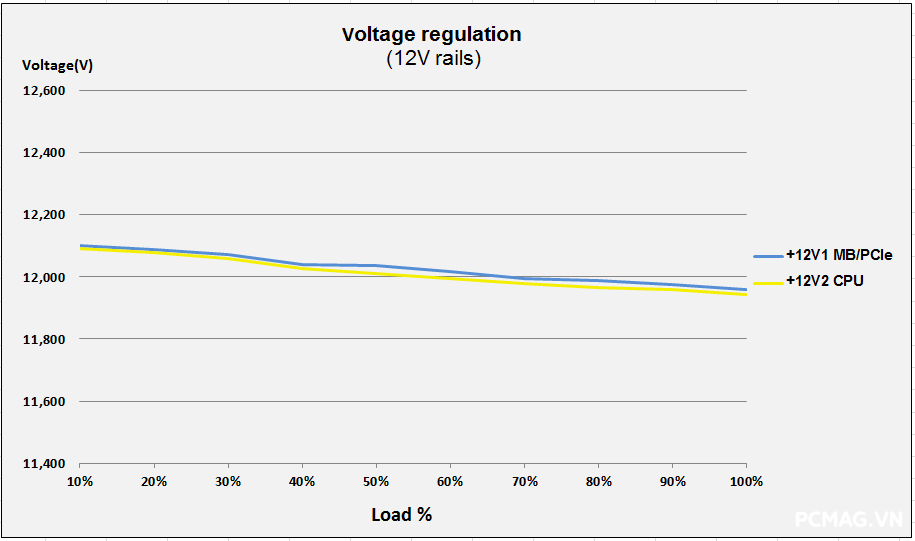 Kết quả cho thấy MSI MPG A850G 850W ATX 3.0 / PCIe 5.0 duy trì mức điện áp dao động ổn định trên tất cả các đường điện, luôn nằm trong giới hạn cho phép của chuẩn ATX.