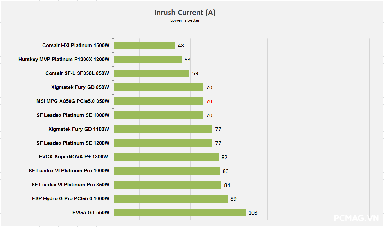 Dòng khởi động của MSI MPG A850G 850W ATX 3.0 / PCIe 5.0 ghi nhận ở mức trung bình khoảng 70A, tương đương với các bộ nguồn cùng phân khúc. Mức này được đánh giá là hợp lý, đảm bảo khả năng khởi động ổn định mà không gây ảnh hưởng đến hệ thống điện tổng thể.