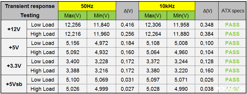 Bài test được thực hiện với tải tụ 3300µF trên mỗi rail (12V1, 12V2, 5V, 3.3V, 5VSB), cùng tốc độ thay đổi dòng (slew rate) theo chuẩn Intel ATX 3.0: