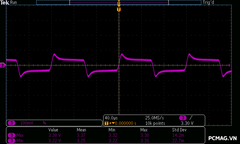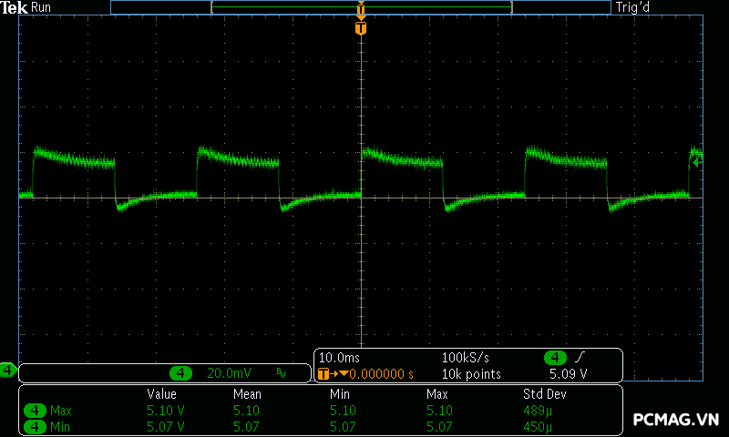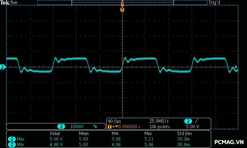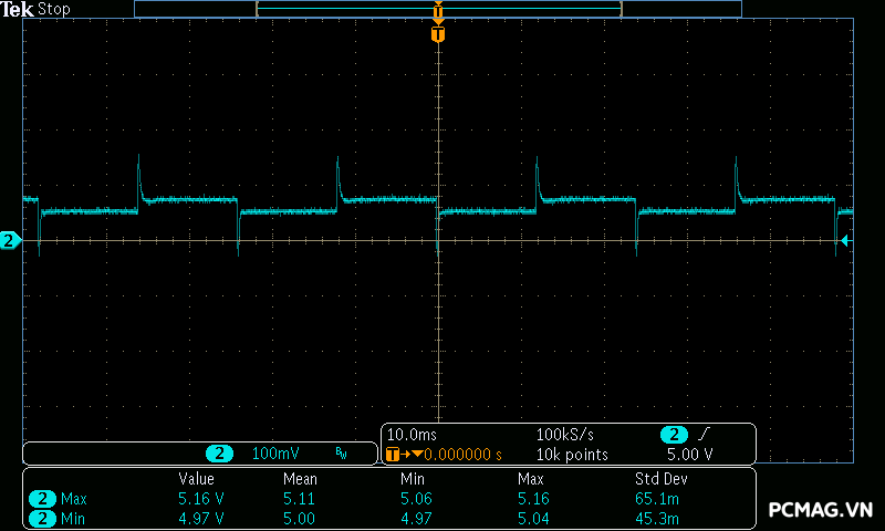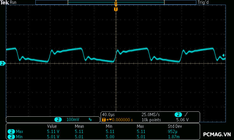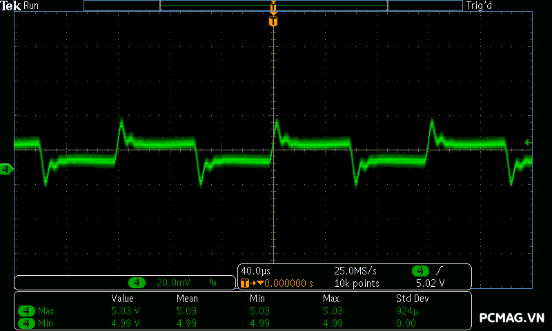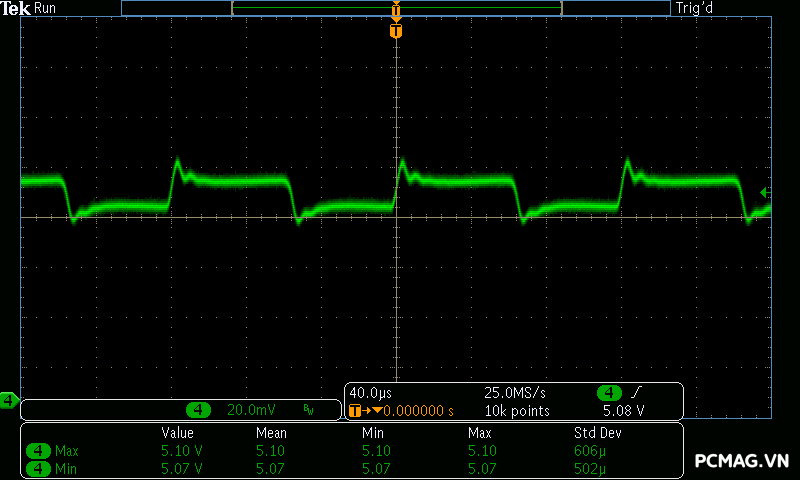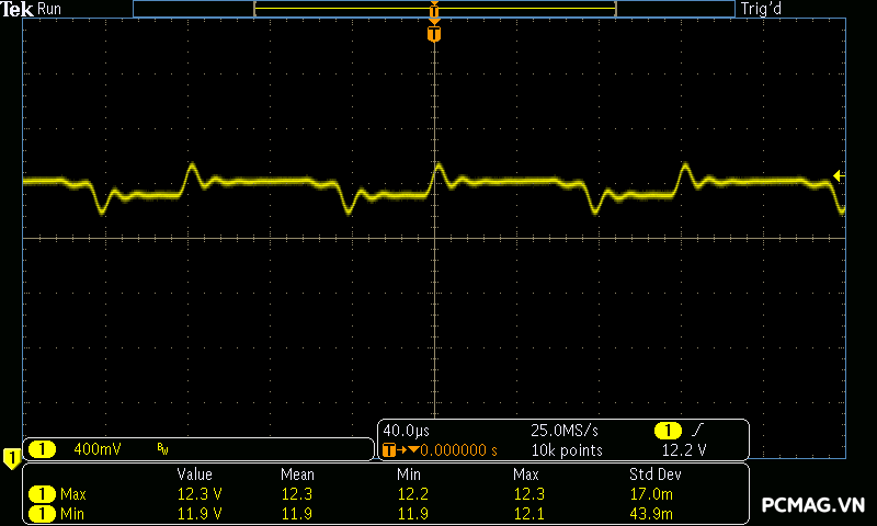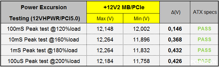 Trong bài test mô phỏng tải đột biến từ GPU (power excursion), bộ nguồn dễ dàng vượt qua với độ ổn định cao, không xảy ra hiện tượng sụt áp nghiêm trọng hay “sập nguồn”, khẳng định khả năng đáp ứng tốt với các hệ thống sử dụng VGA thế hệ mới.