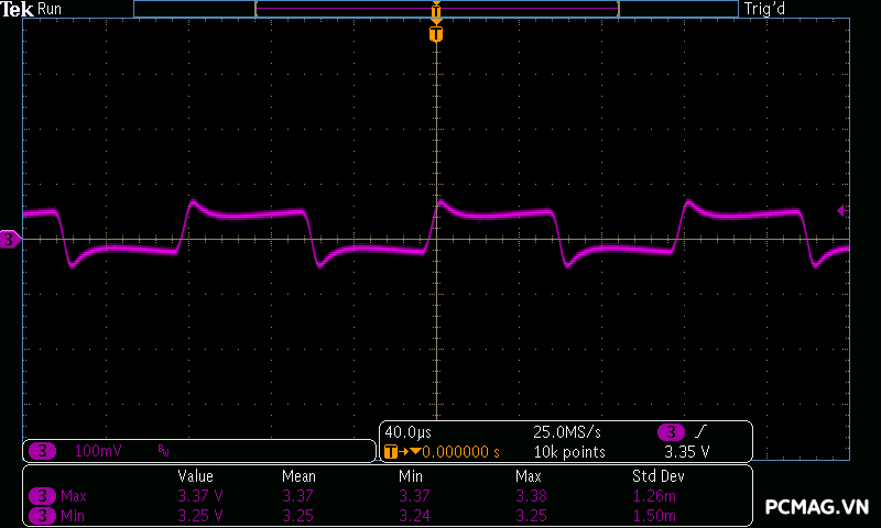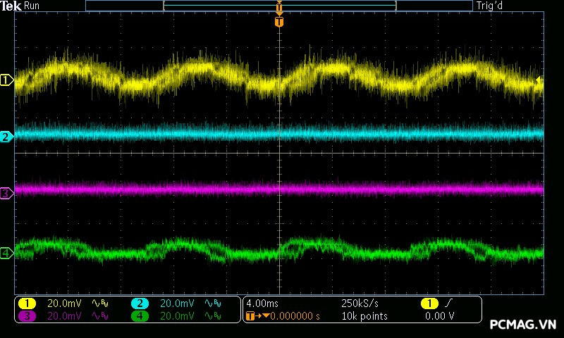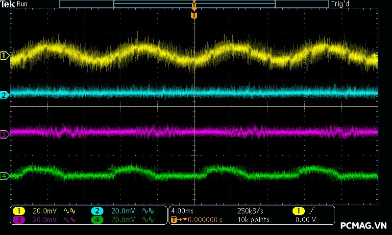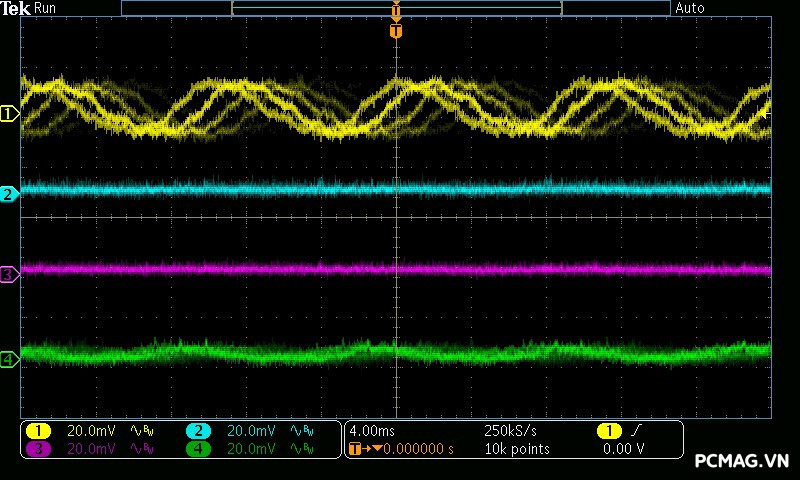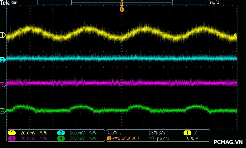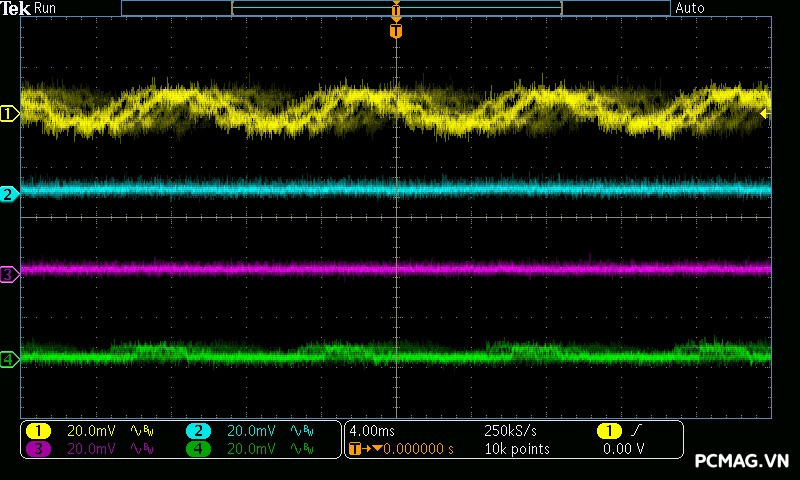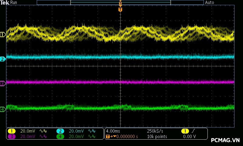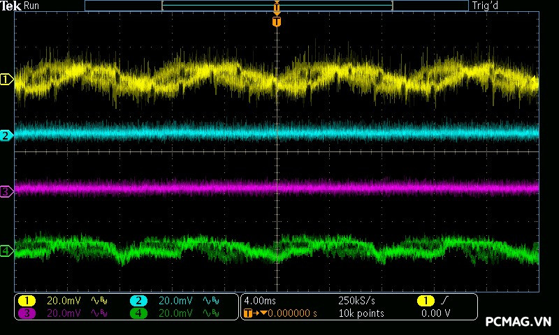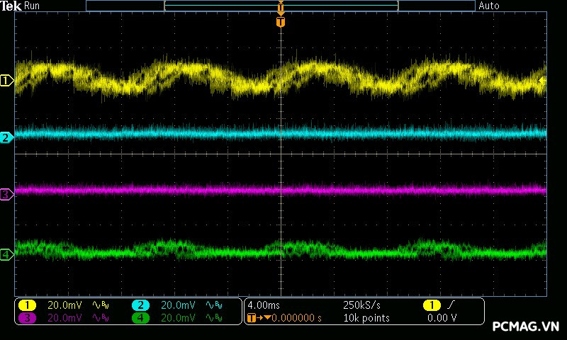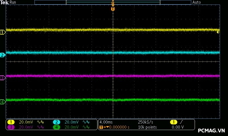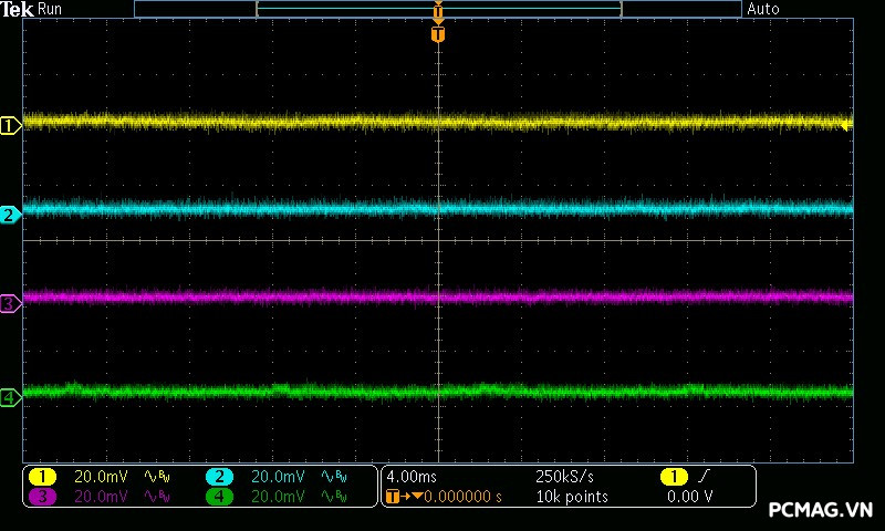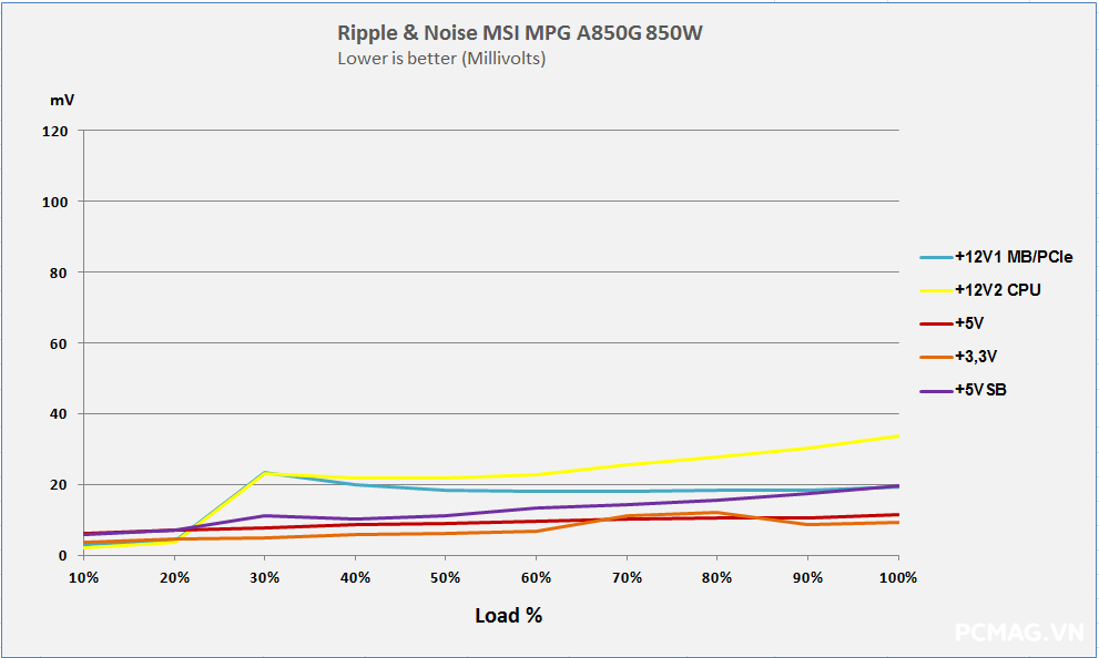 Mức nhiễu cao tần của MSI MPG A850G 850W ATX 3.0 / PCIe 5.0 được kiểm soát rất tốt, với giá trị tối đa chỉ khoảng ~30mV trên cả ba đường điện chính. Đây là kết quả ấn tượng, đảm bảo nguồn điện sạch và ổn định, góp phần bảo vệ linh kiện và nâng cao tuổi thọ hệ thống.