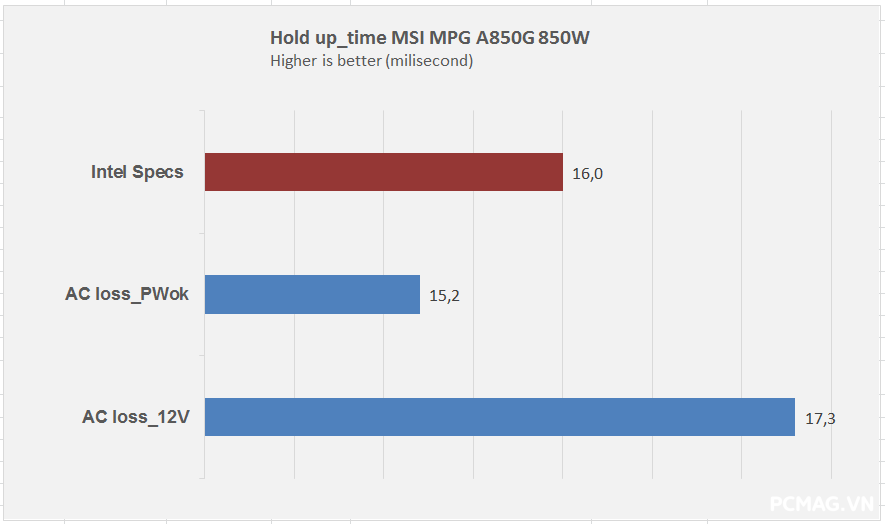 MSI MPG A850G 850W ATX 3.0 / PCIe 5.0 đáp ứng vừa đủ tiêu chuẩn ATX về thời gian lưu điện. Cụ thể, tín hiệu PG_OK đạt khoảng 15.2ms trên mức yêu cầu 16ms, trong khi đường 12V duy trì trong ngưỡng an toàn lên tới 17.3ms (so với chuẩn 17ms).