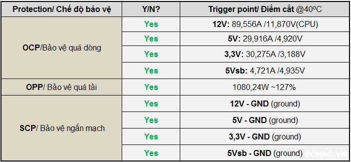 Các cơ chế bảo vệ trên MSI MPG A850G 850W ATX 3.0 / PCIe 5.0 hoạt động hiệu quả và có độ phản hồi nhanh. Trong quá trình thử nghiệm, bộ nguồn thể hiện khả năng bảo vệ ổn định, không ghi nhận bất kỳ vấn đề nào – cho thấy độ tin cậy cao trong việc đảm bảo an toàn cho toàn hệ thống.
