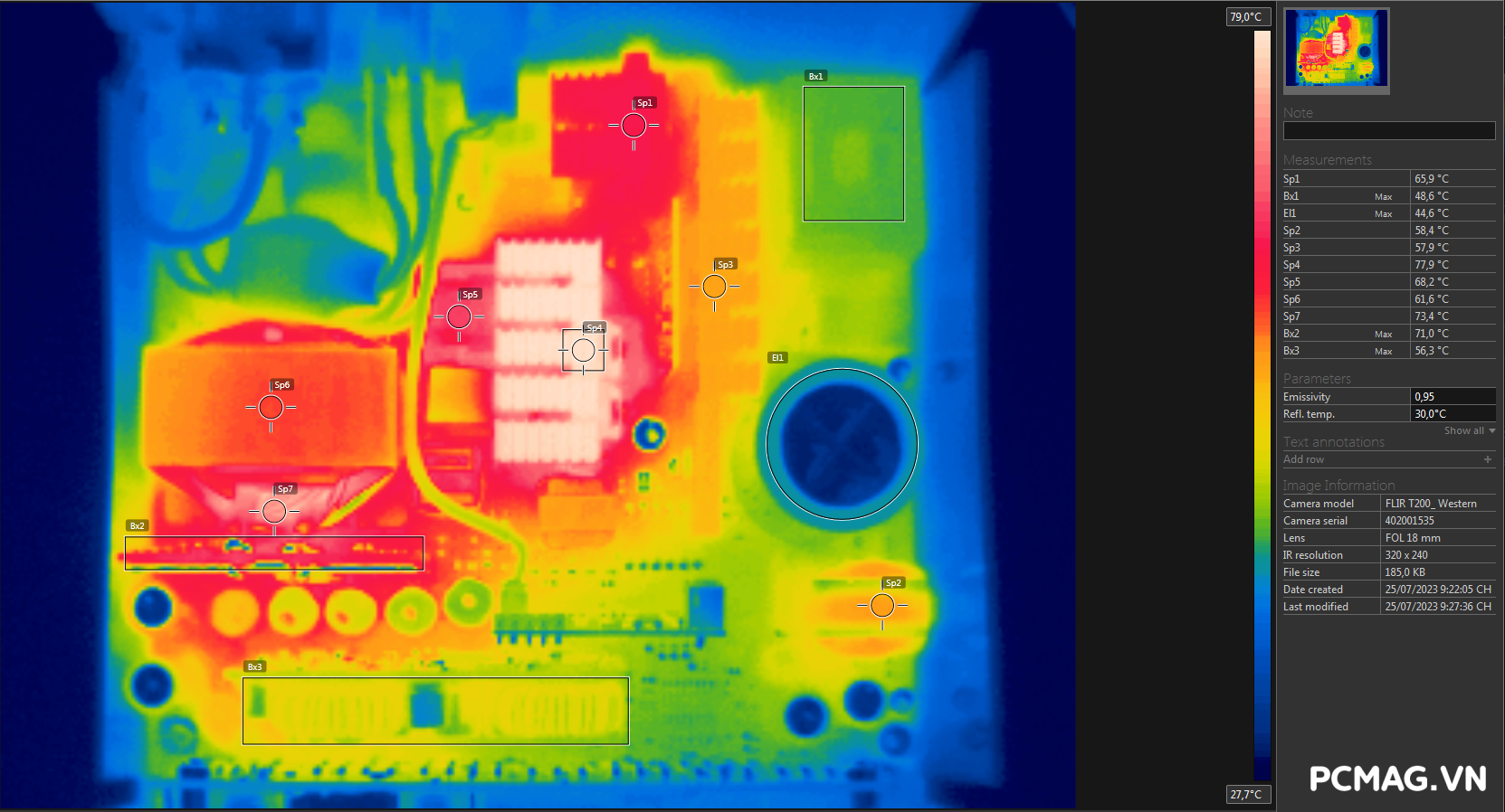 Cách điều chỉnh này giúp bộ nguồn vận hành êm ái theo từng mức tải. Tuy nhiên, qua ảnh nhiệt có thể thấy khu vực nóng nhất nằm ở cặp MOSFET tầng LLC/PWM, với nhiệt độ dao động quanh mức ~80°C, vẫn nằm trong ngưỡng an toàn cho linh kiện.