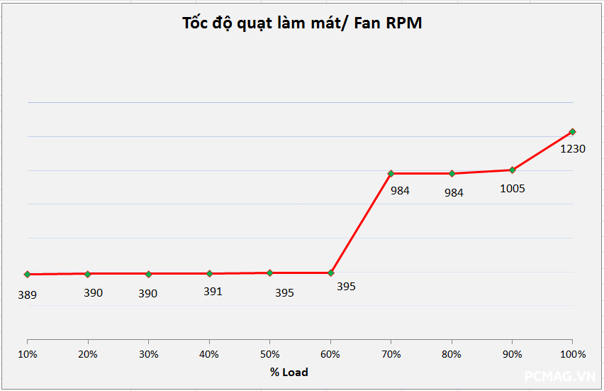 Trong điều kiện môi trường từ 38–45°C, MSI MPG A850G 850W ATX 3.0 / PCIe 5.0 được thử nghiệm với chế độ semi-fanless tắt. Quạt sẽ hoạt động ngay khi cấp nguồn, duy trì tốc độ rất thấp khoảng ~400 RPM (gần như không gây tiếng ồn) cho đến khi tải vượt 70%, lúc này quạt mới bắt đầu tăng tốc dần và đạt tối đa khoảng ~1300 RPM.