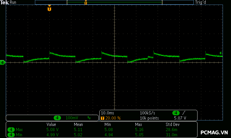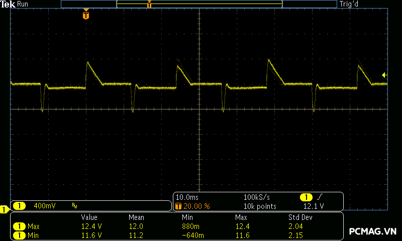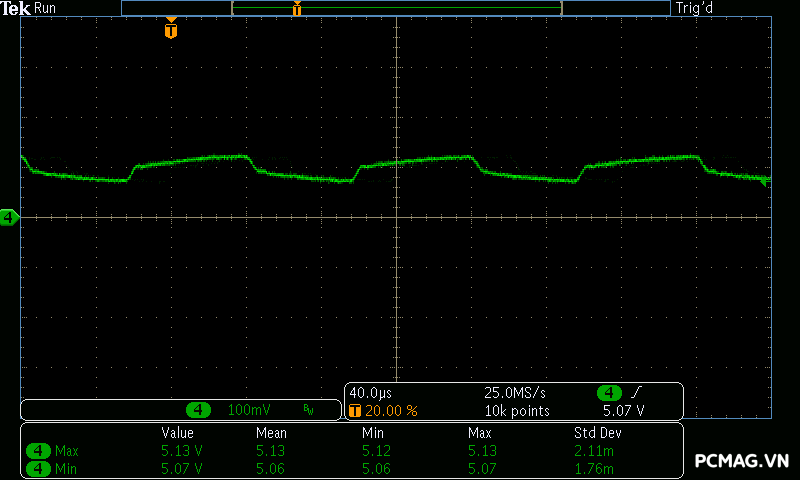 Tuy nhiên, với mức 200% peak load chỉ diễn ra trong khoảng 100µs, thời gian quá ngắn để mạch bảo vệ phát hiện và kích hoạt. Trong tình huống này, hệ thống tụ rắn ở đầu ra đã phát huy tác dụng, giúp ổn định điện áp và duy trì các thông số vẫn nằm trong giới hạn tiêu chuẩn ATX.