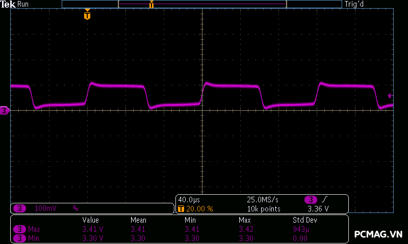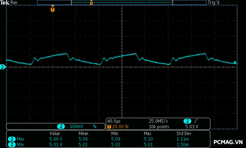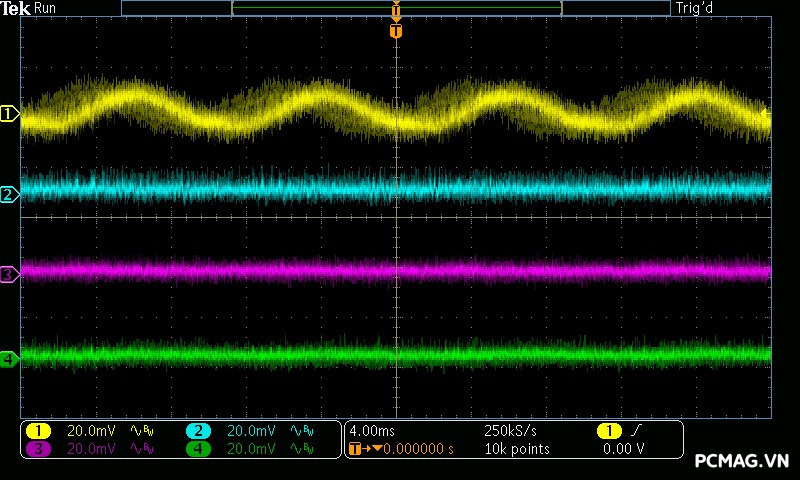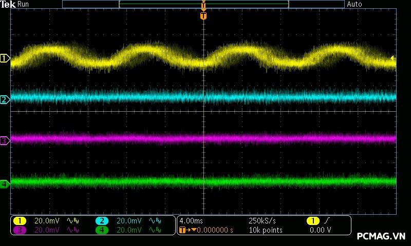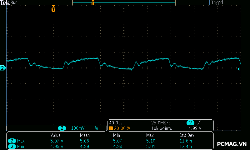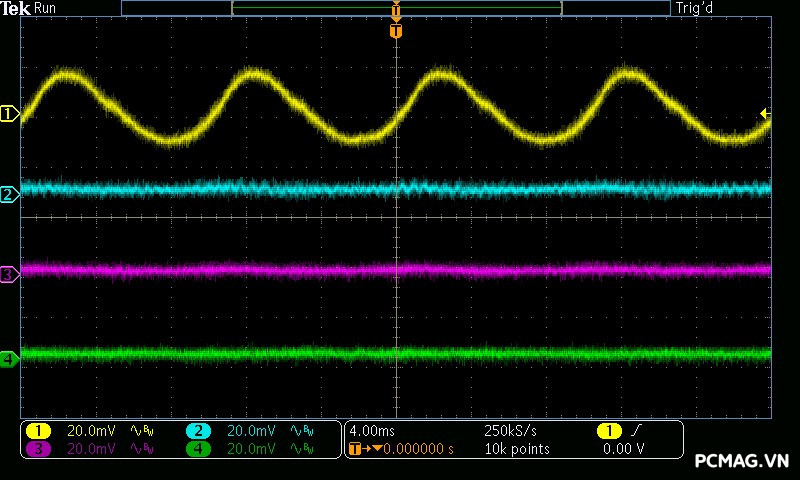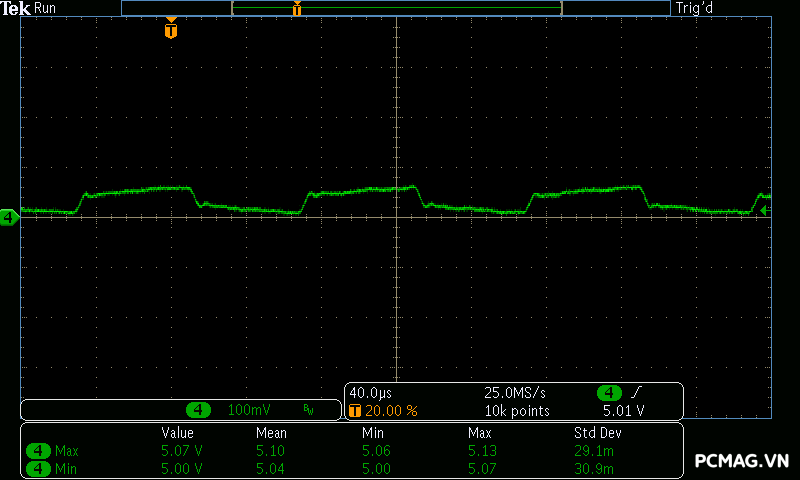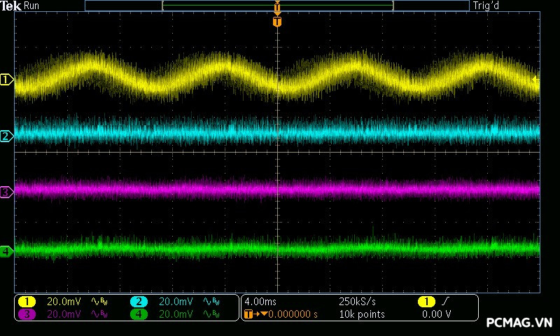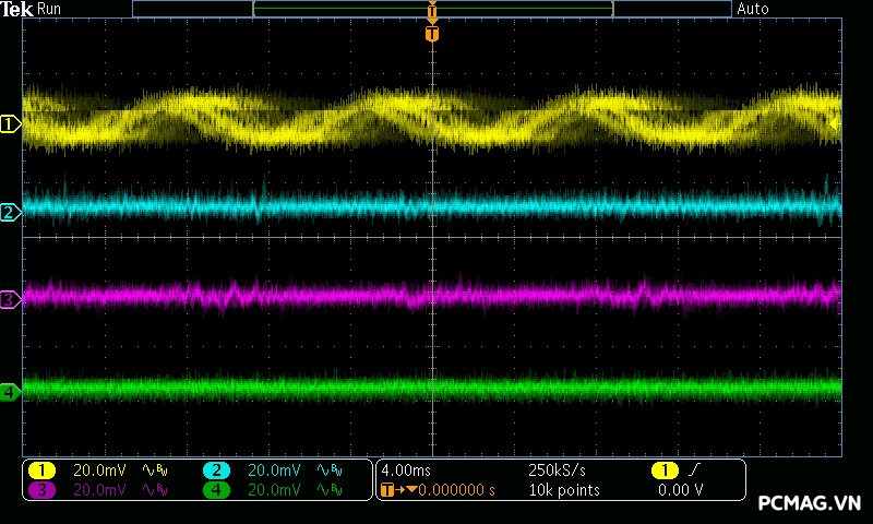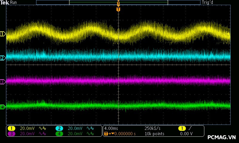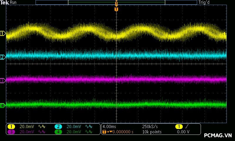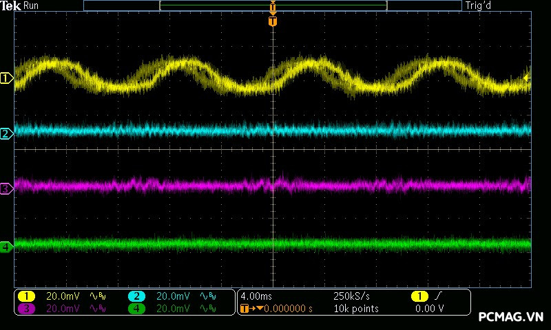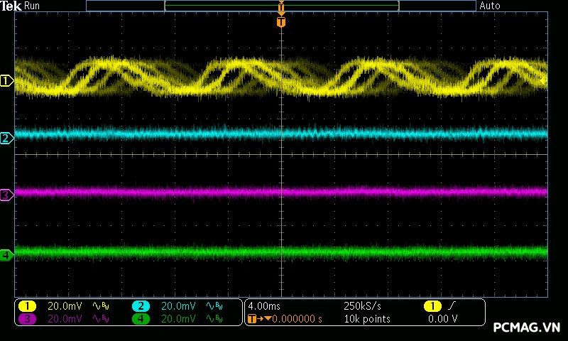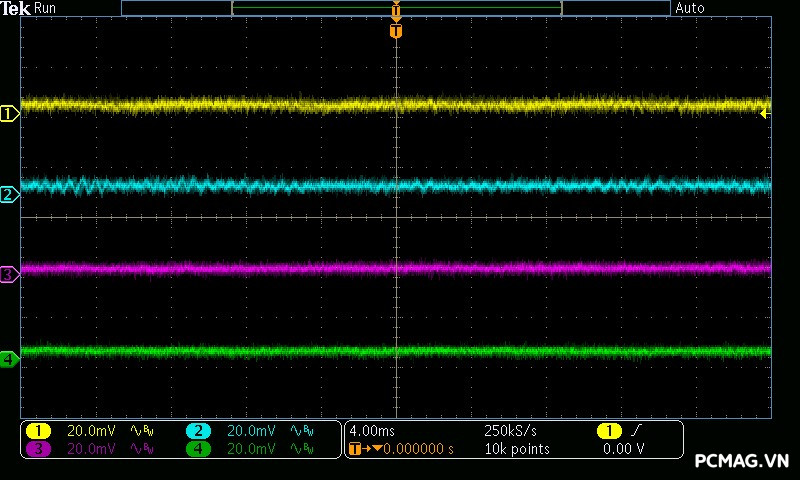 Cụ thể, mức nhiễu cao tần trên đường +12V chỉ dao động khoảng 30mV, trong khi các đường điện còn lại như +5V và +3.3V chỉ ở mức khoảng 20mV. Các giá trị này thấp hơn đáng kể so với giới hạn cho phép của chuẩn ATX, cho thấy khả năng lọc nhiễu hiệu quả và chất lượng điện áp đầu ra ổn định của bộ nguồn. ⚡