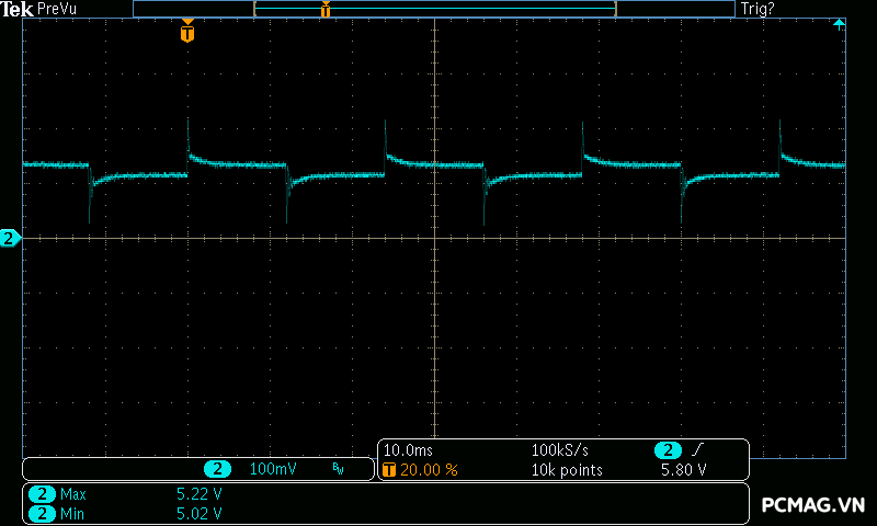 Ở bài test mô phỏng power excursion – tình huống GPU tiêu thụ dòng tức thời cao – bộ nguồn vượt qua dễ dàng. Điện áp vẫn nằm trong giới hạn cho phép và không xuất hiện hiện tượng sập nguồn hay mất ổn định, cho thấy khả năng đáp ứng tải đỉnh của PM850W thực sự ấn tượng.