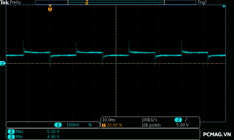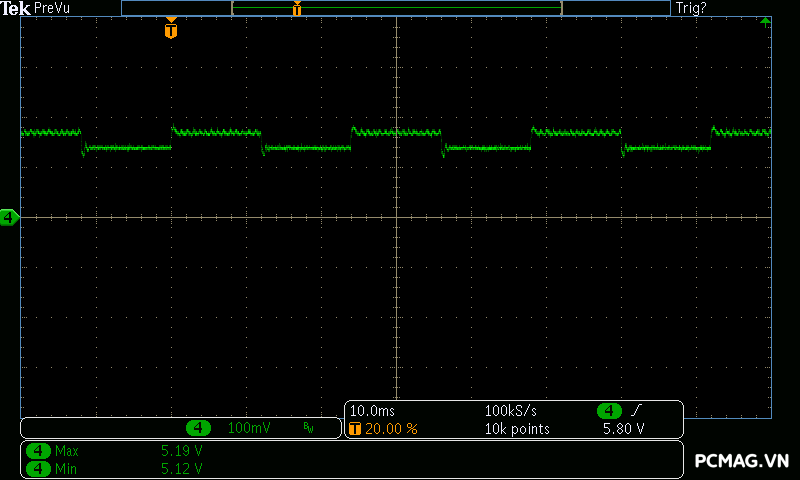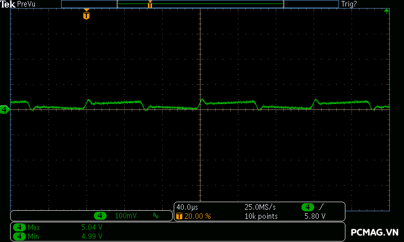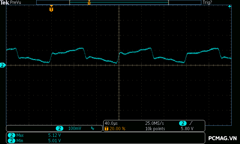 Nhờ thiết kế DC to DC, các đường điện 5V và 3.3V vẫn giữ được độ ổn định cao ngay cả trong các bài test tải lệch (Cross Load – CL), đảm bảo nguồn hoạt động ổn định trong nhiều kịch bản sử dụng thực tế.