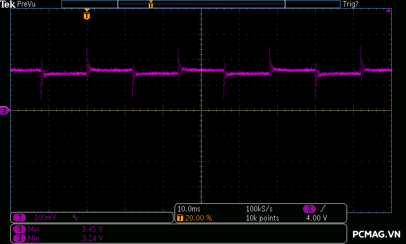 Trong quá trình kiểm tra, Segotep PM850W ATX 3.1 / PCIe 5.1 cho thấy biên độ dao động điện áp trên các rail ở mức khá thấp. Điểm đáng chú ý là đường 3.3V có thời điểm lệch khỏi chuẩn ATX khoảng 0.02V, một mức sai số rất nhỏ và gần như không ảnh hưởng đến vận hành thực tế.