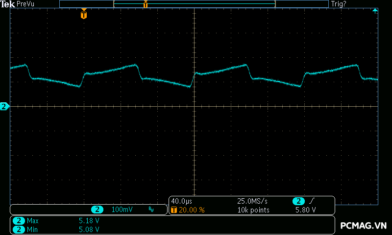 Thông số này thấp hơn đáng kể so với giới hạn cho phép của chuẩn ATX, cho thấy khả năng lọc nhiễu đầu ra hiệu quả và nền tảng thiết kế mạch thứ cấp được tối ưu tốt. Đây là yếu tố quan trọng giúp hệ thống vận hành ổn định lâu dài, đặc biệt với các cấu hình sử dụng CPU và GPU hiệu năng cao.