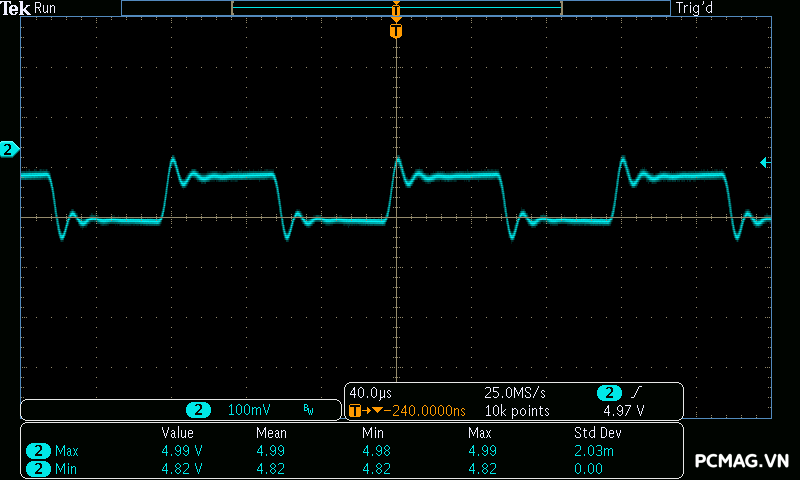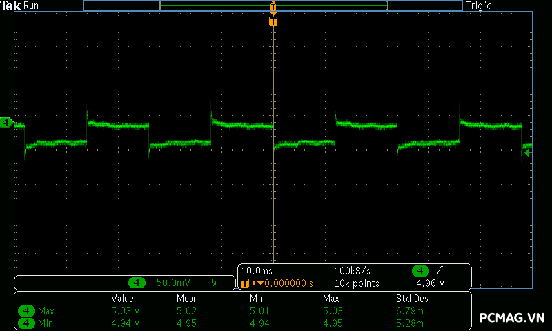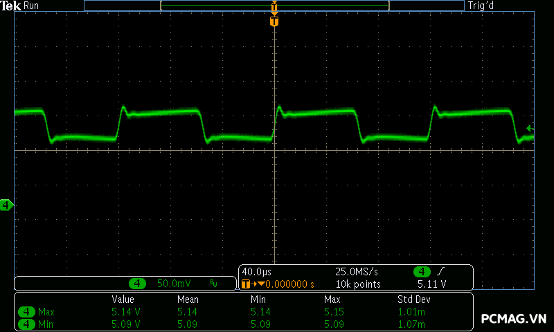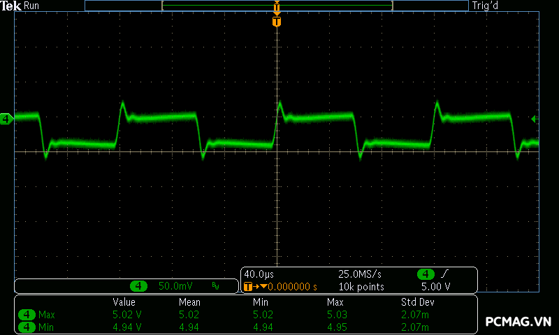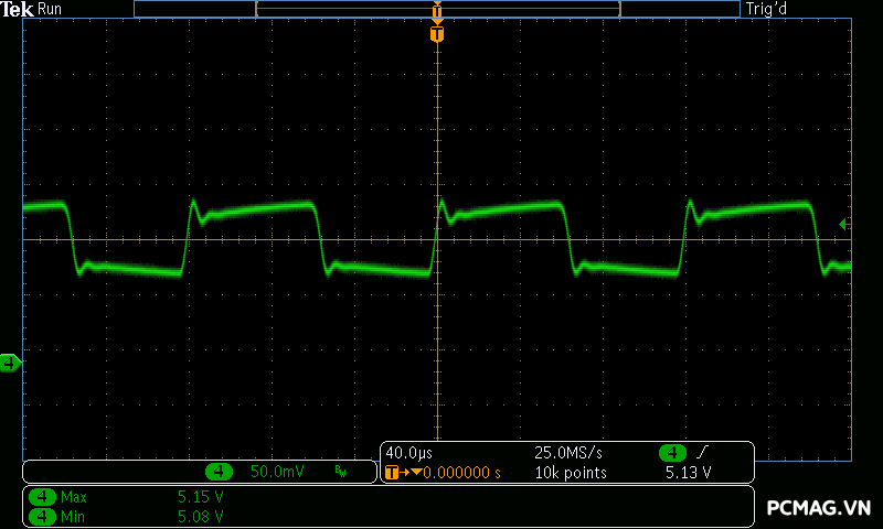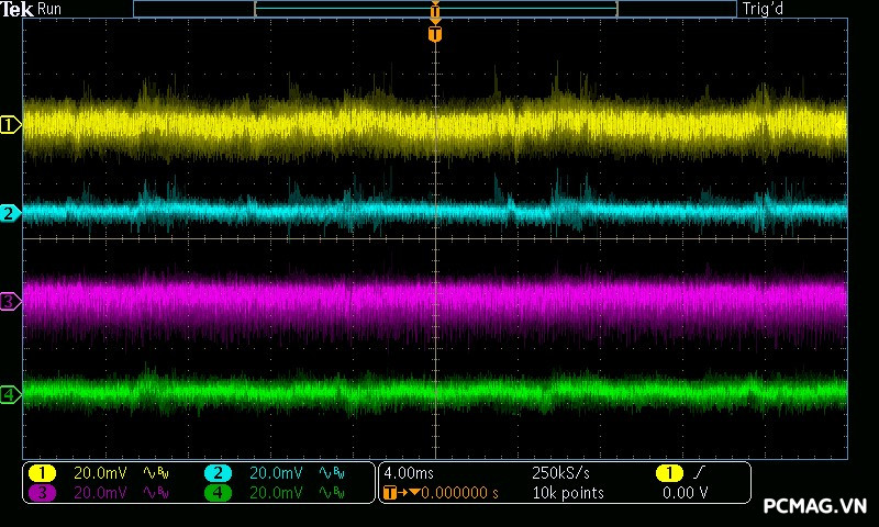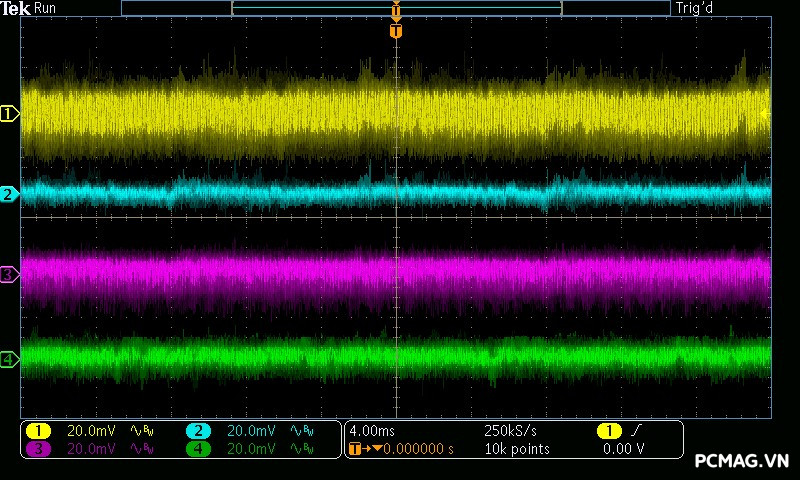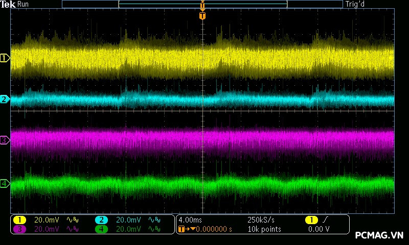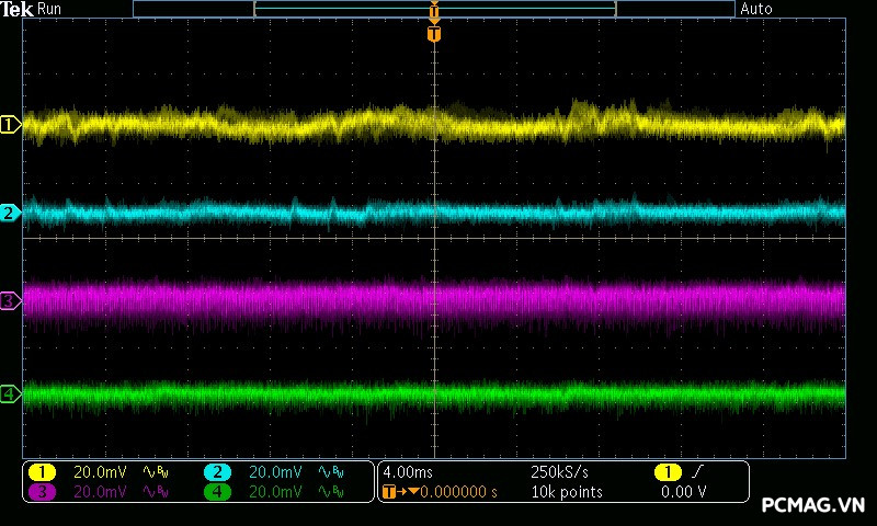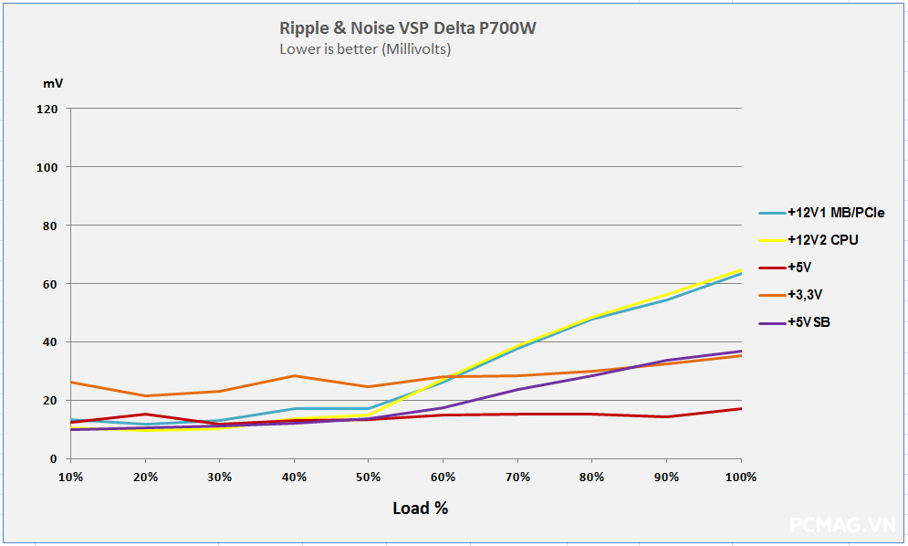 Mức nhiễu Ripple & Noise trên Delta P600W & P700W được kiểm soát ở mức khá, với giá trị tối đa dao động khoảng 50–65mV trên cả 3 đường điện chính, vẫn nằm trong giới hạn cho phép.