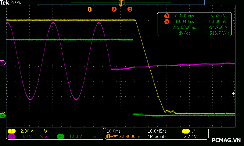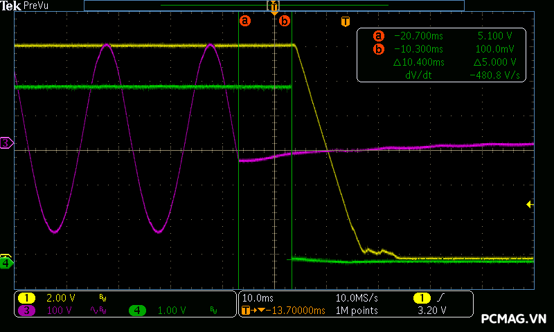 Dòng khởi động của Delta P600W & P700W ở mức trung bình, ghi nhận khoảng 80A–90A tại 230Vac/90°, cho thấy khả năng kiểm soát dòng nạp ban đầu ở mức ổn định.