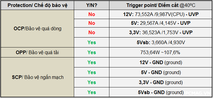 Các cơ chế bảo vệ trên Delta P600W & P700W hoạt động tương đối ổn định. Do không được trang bị OCP (bảo vệ quá dòng), nên UVP đóng vai trò như “hàng rào thứ hai” để ngăn PSU rơi vào trạng thái quá tải nguy hiểm.