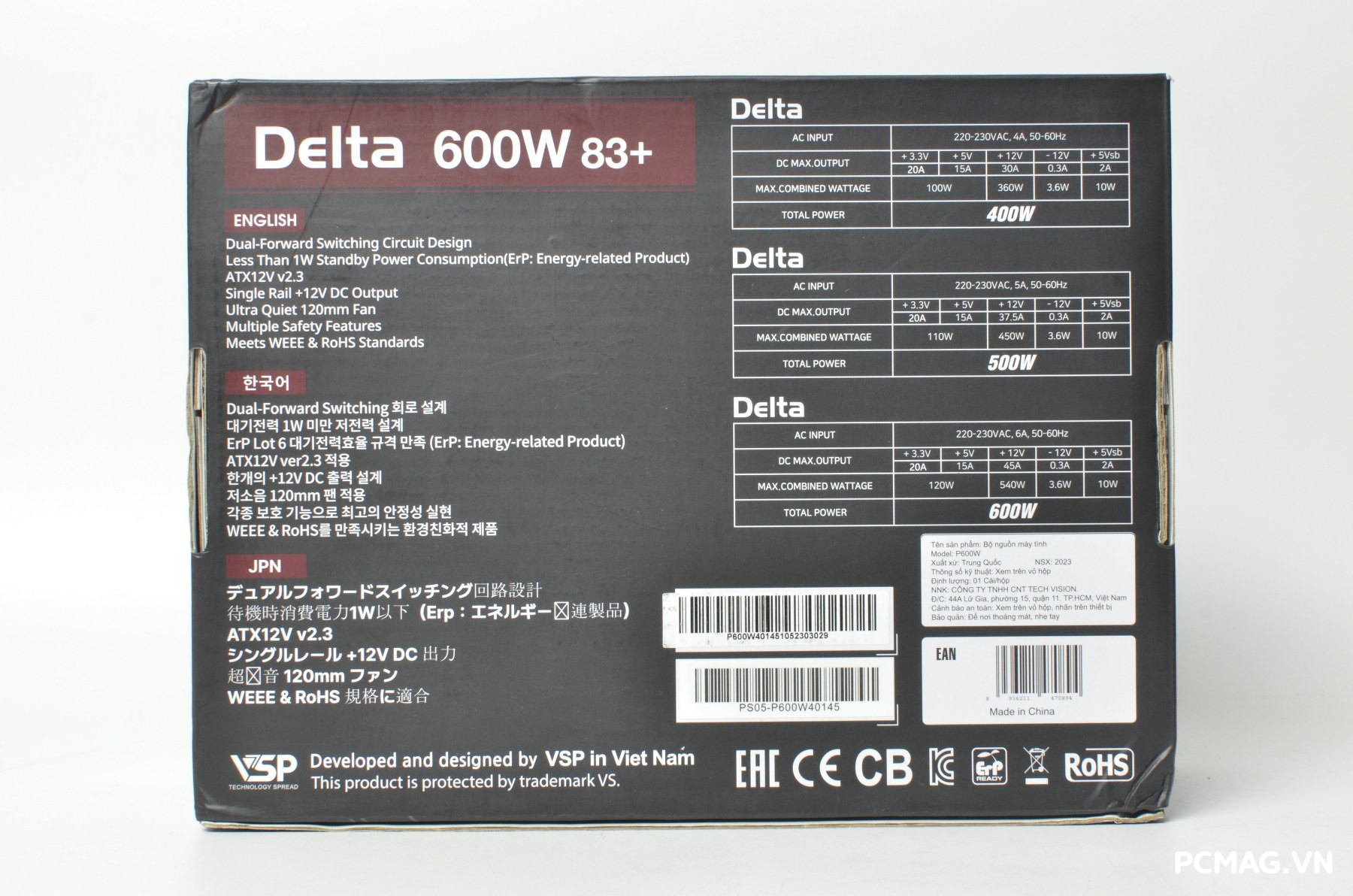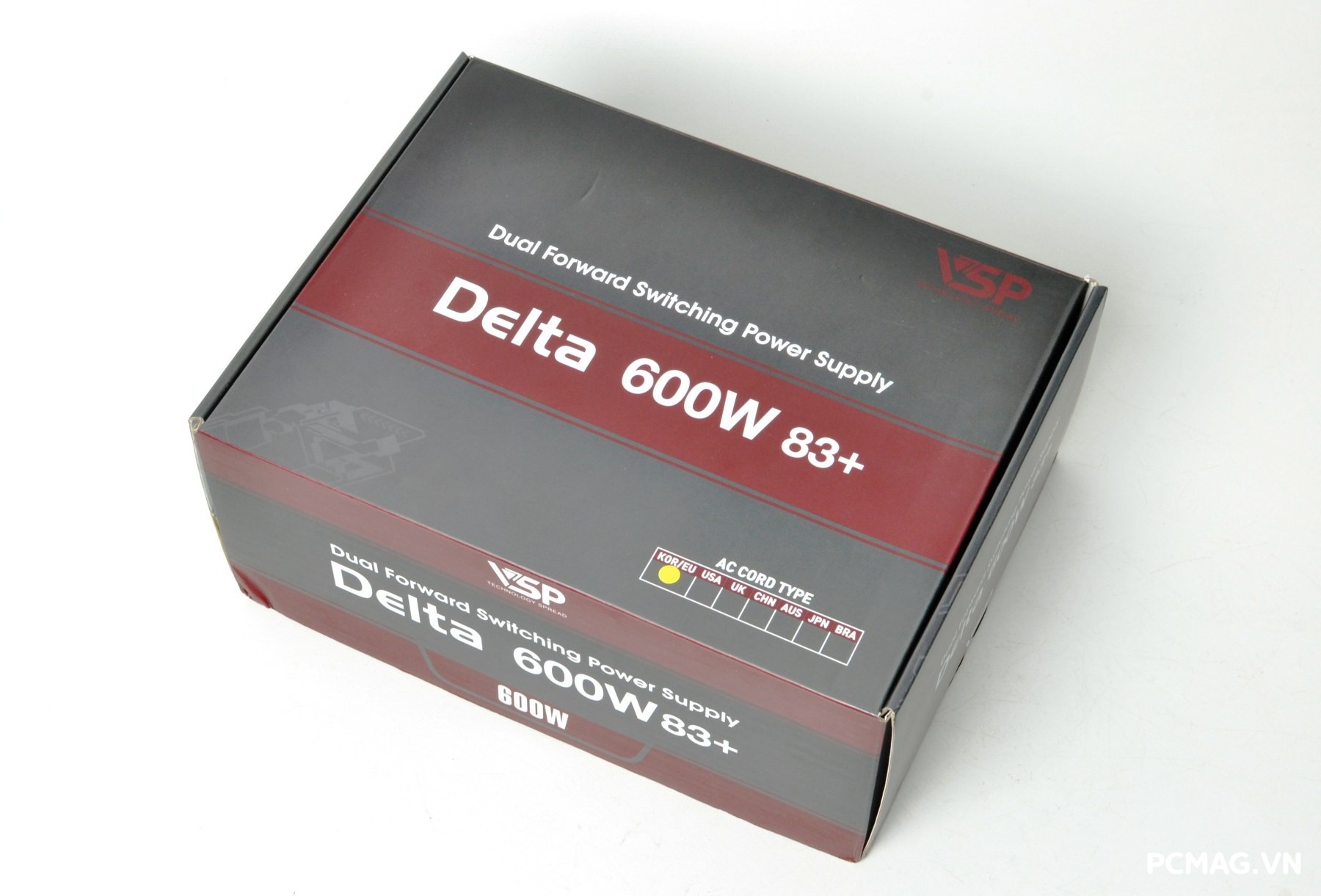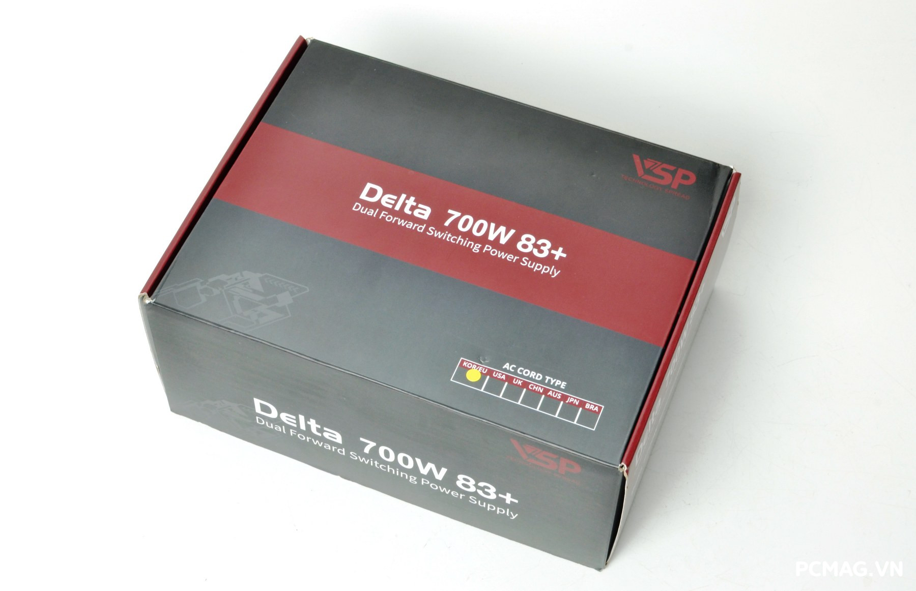 Dòng nguồn VSP Delta được đóng gói trong hộp với tông màu xám kết hợp đỏ nâu đặc trưng, mang phong cách đơn giản nhưng dễ nhận diện. Giữa hai phiên bản P600W và P700W có một vài khác biệt nhỏ trong thiết kế vỏ hộp, chủ yếu nằm ở chi tiết bố cục và thông tin sản phẩm được in trên bao bì.
