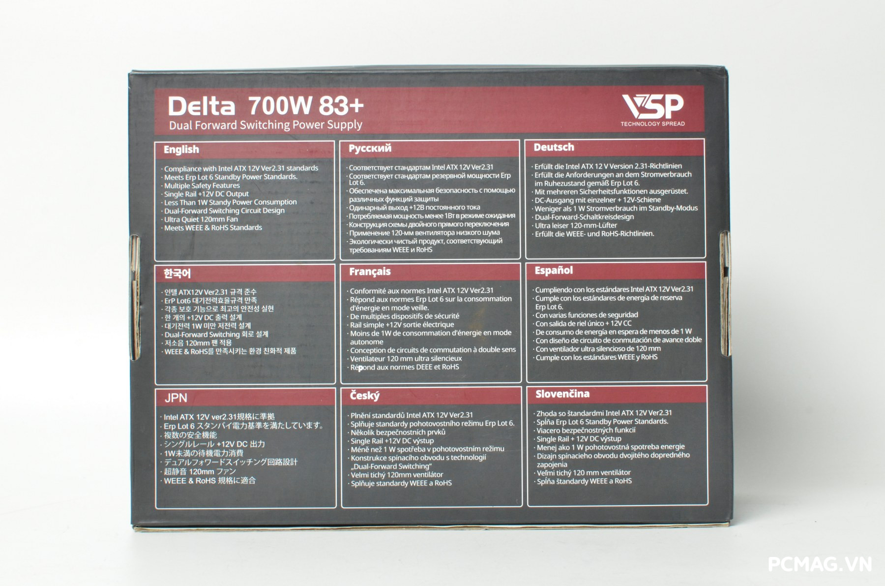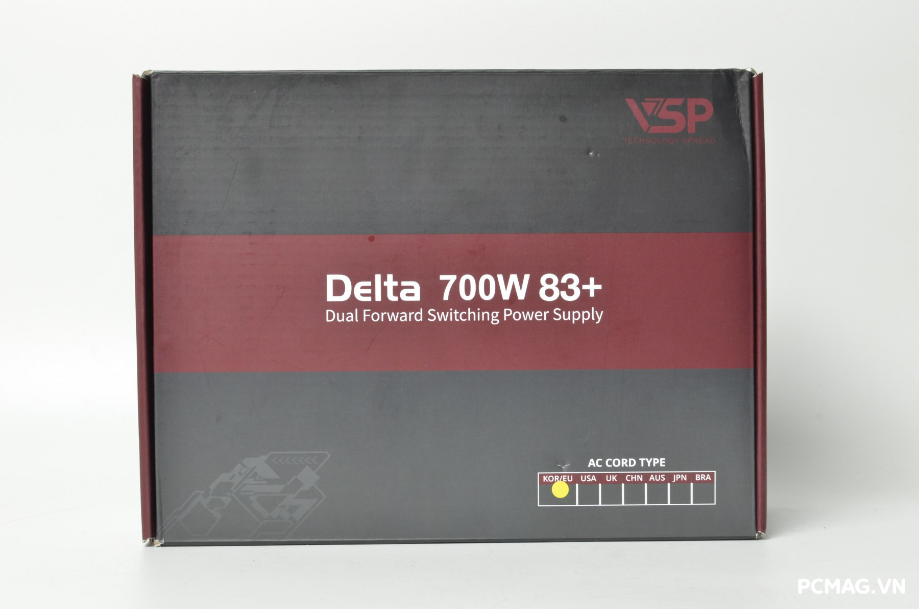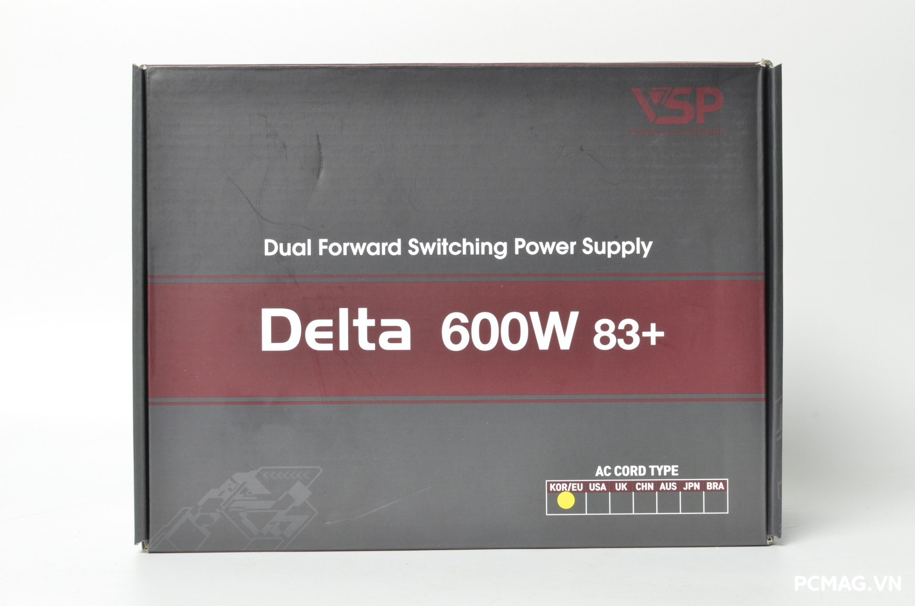 Dòng nguồn VSP Delta được đóng gói trong hộp với tông màu xám kết hợp đỏ nâu đặc trưng, mang phong cách đơn giản nhưng dễ nhận diện. Giữa hai phiên bản P600W và P700W có một vài khác biệt nhỏ trong thiết kế vỏ hộp, chủ yếu nằm ở chi tiết bố cục và thông tin sản phẩm được in trên bao bì.