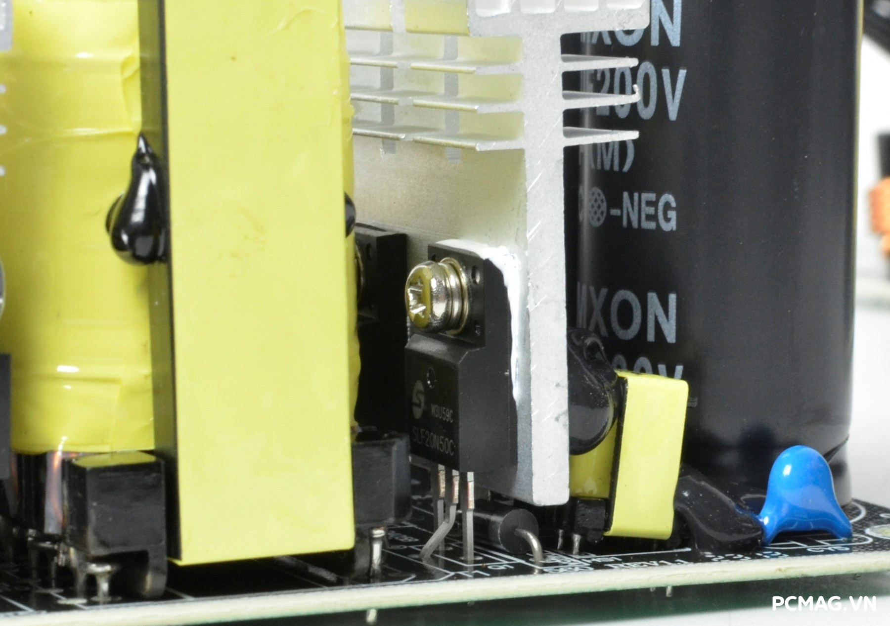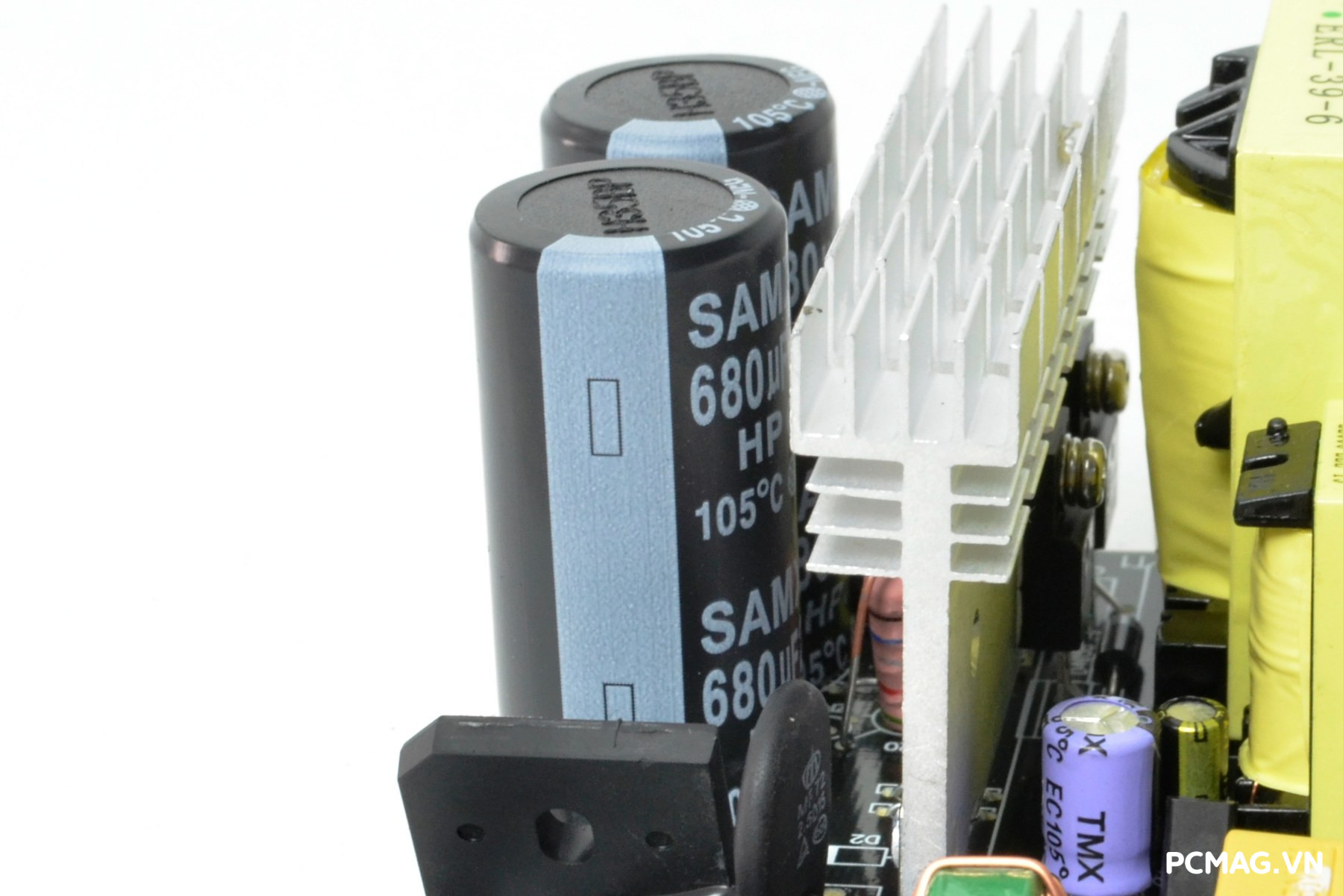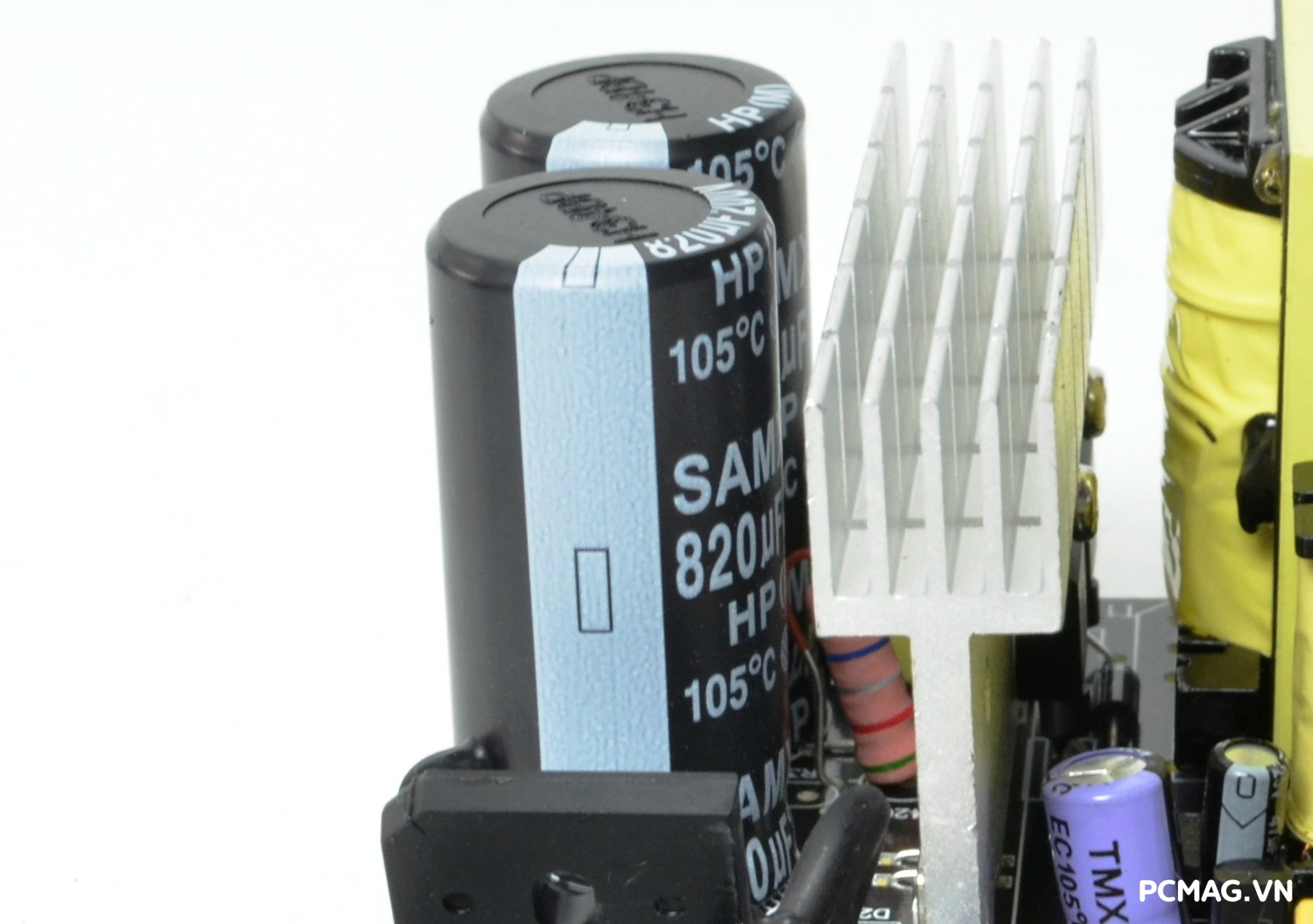 P600W sử dụng cặp tụ chính SAMXON dung lượng 680µF/200V, trong khi phiên bản P700W được trang bị tụ 820µF/200V mắc nối tiếp. Đây được xem là “dấu vết” của thiết kế mạch nhân đôi điện áp – thường xuất hiện trên các bộ nguồn có công tắc gạt chuyển điện áp 110–220V màu đỏ.