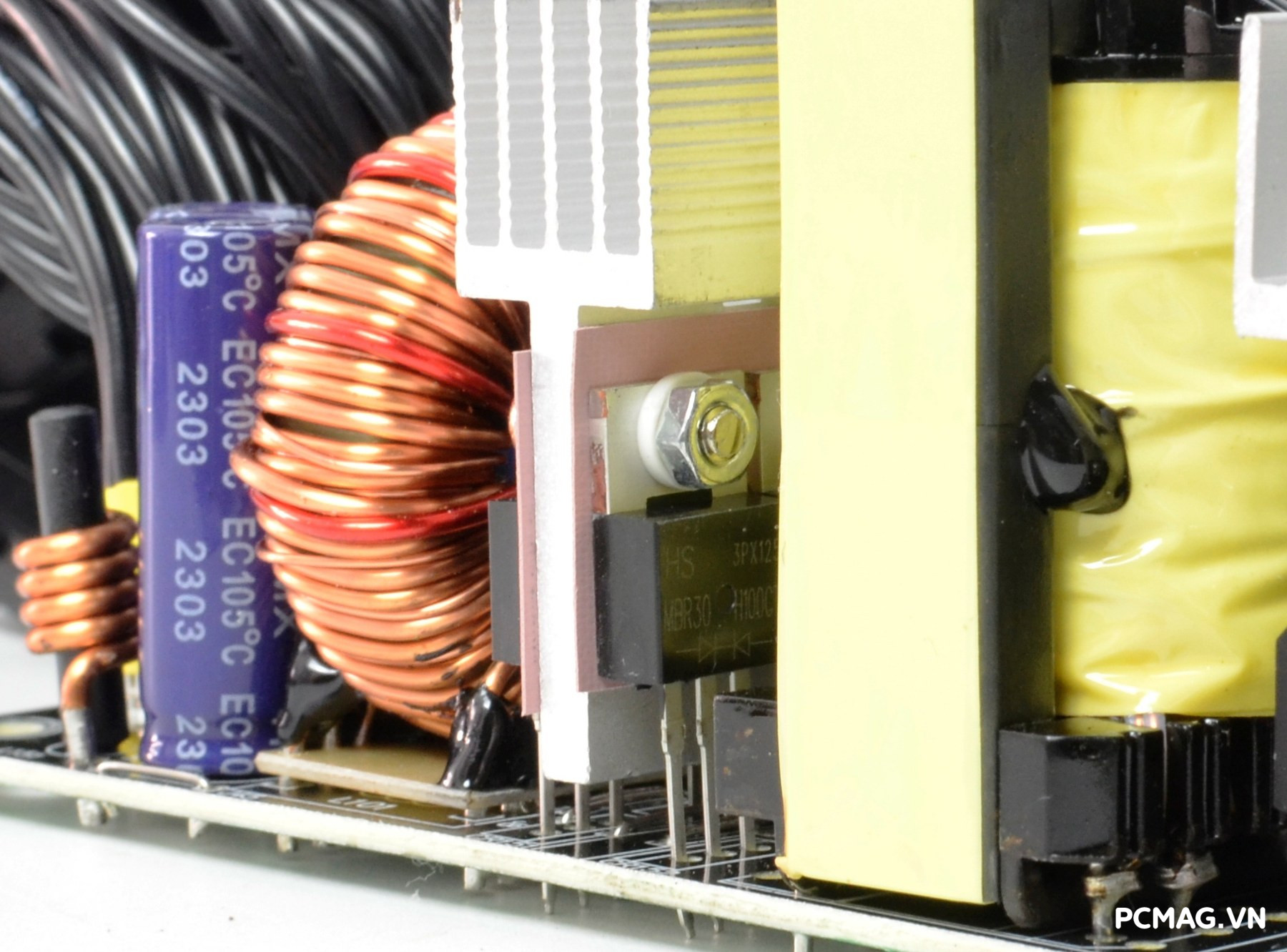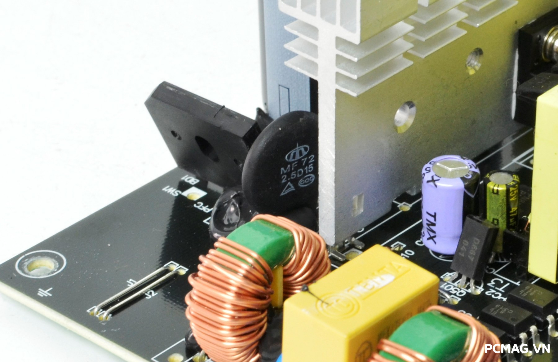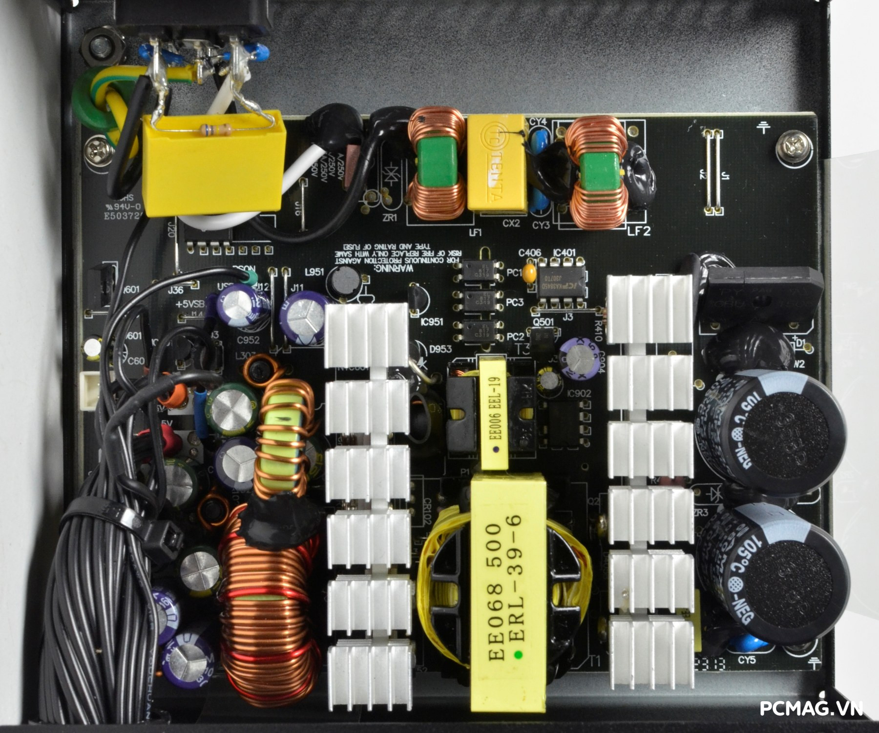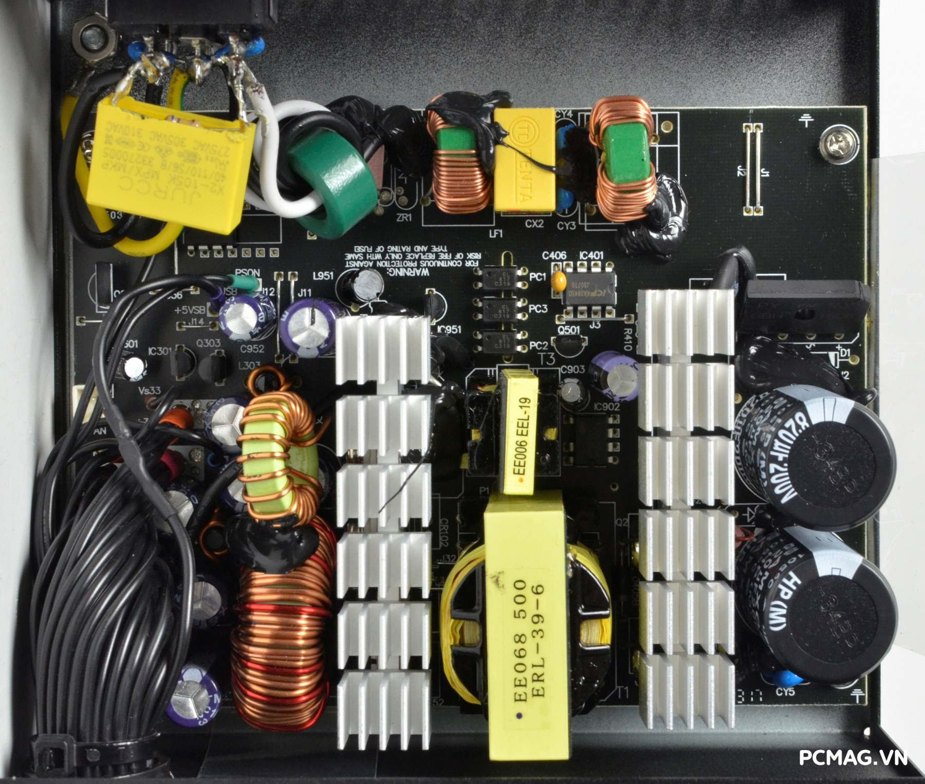 Mạch lọc nhiễu EMI được trang bị đầy đủ với thiết kế 2 tầng, giúp giảm thiểu nhiễu và đảm bảo tín hiệu điện ổn định. Đặc biệt, phiên bản P700W còn bổ sung thêm một cuộn lọc nhỏ đặt trên dây nguồn trước khi vào bo mạch chính, với các vòng dây quấn quanh lõi xuyến ferrite, góp phần tăng hiệu quả chống nhiễu.