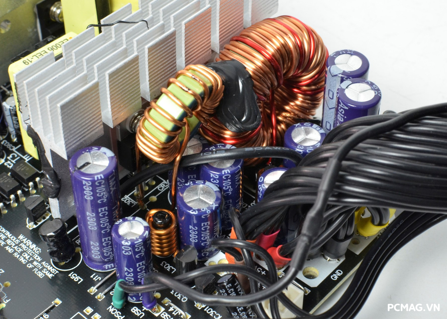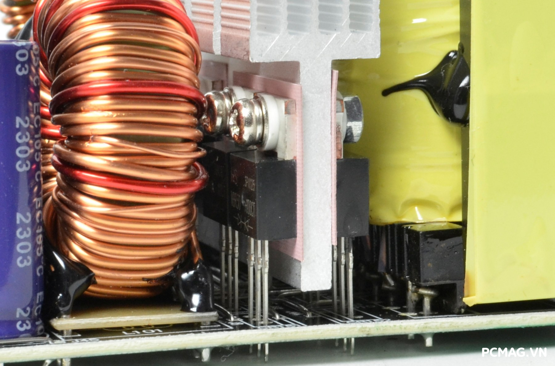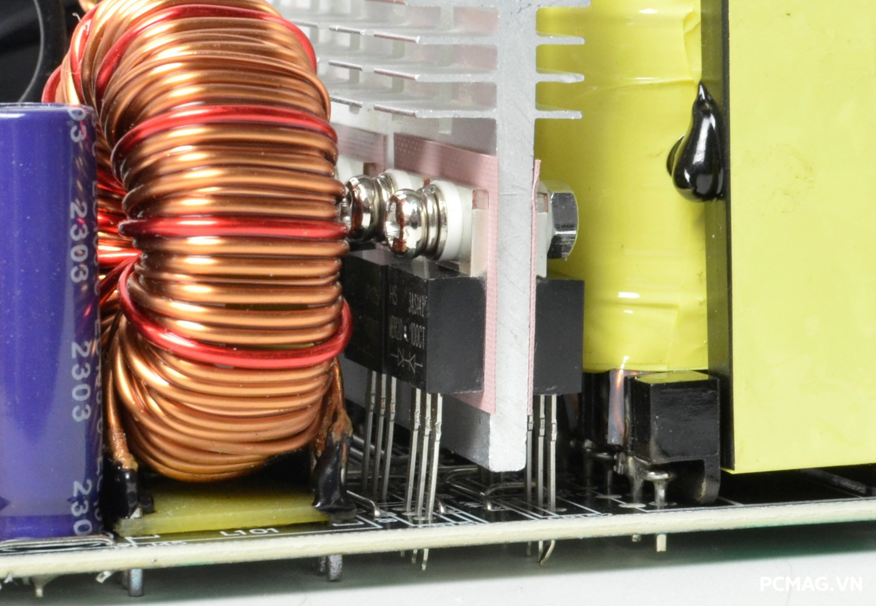 Mạch lọc nhiễu EMI được trang bị đầy đủ với thiết kế 2 tầng, giúp giảm thiểu nhiễu và đảm bảo tín hiệu điện ổn định. Đặc biệt, phiên bản P700W còn bổ sung thêm một cuộn lọc nhỏ đặt trên dây nguồn trước khi vào bo mạch chính, với các vòng dây quấn quanh lõi xuyến ferrite, góp phần tăng hiệu quả chống nhiễu.