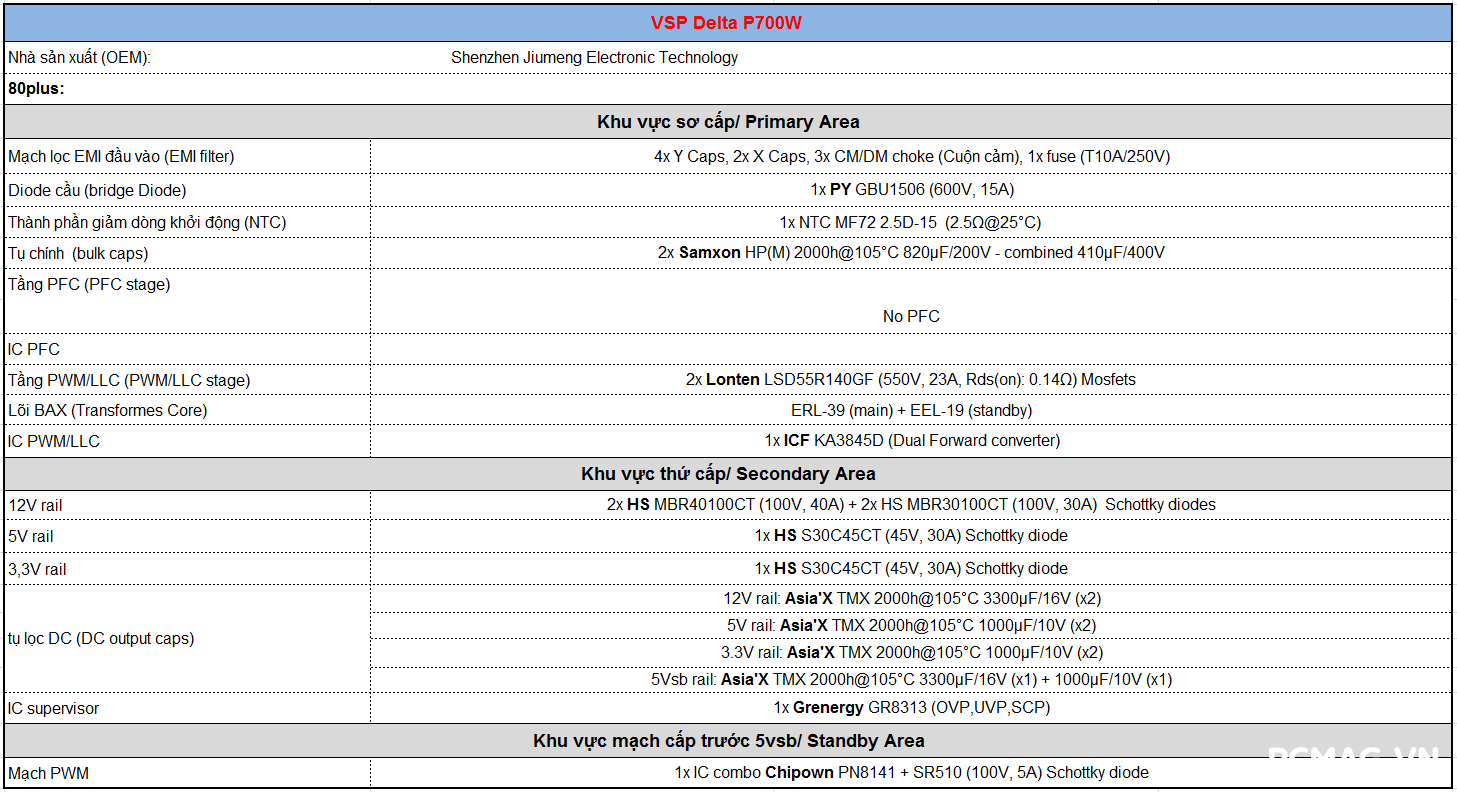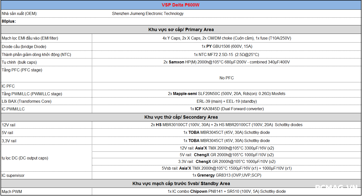 Dòng nguồn VSP Delta P600W & P700W được sản xuất bởi OEM Shenzhen Jiumeng Electronic Technology. Sản phẩm sử dụng thiết kế mạch Dual Forward, tuy nhiên chưa được trang bị công nghệ Active PFC.