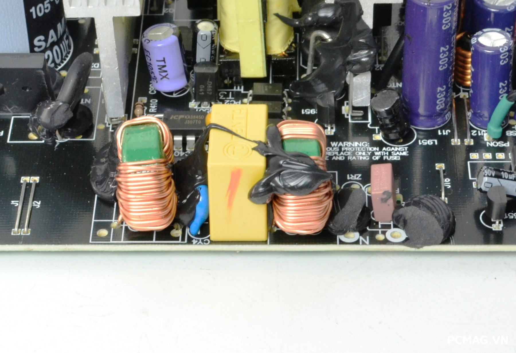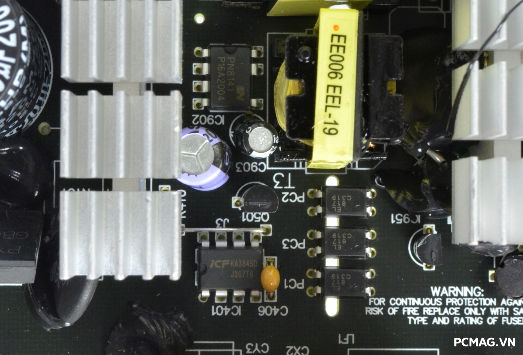 IC dao động KA3845 đảm nhiệm vai trò điều khiển toàn bộ hoạt động của tầng PWM. Phía trên là IC tích hợp Chipown PN8141, phụ trách mạch cấp nguồn chờ 5VSB.