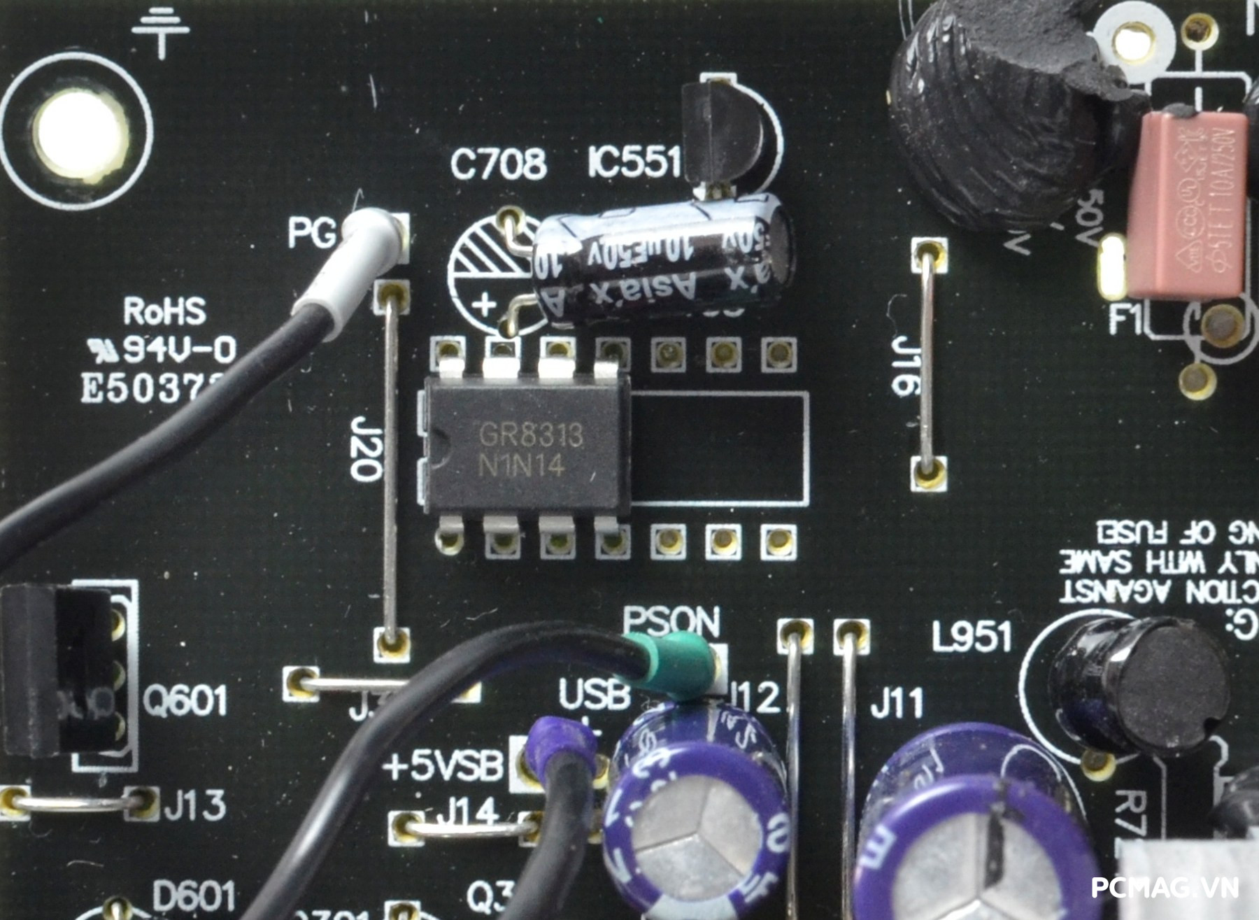 IC giám sát được sử dụng là Grenergy GR8313, hỗ trợ các cơ chế bảo vệ cơ bản như OVP (quá áp), UVP (thấp áp) và SCP (ngắn mạch). Ở phía đầu ra, nguồn Delta P600W & P700W sử dụng tụ của hai thương hiệu Asia’X và Cheng’X.