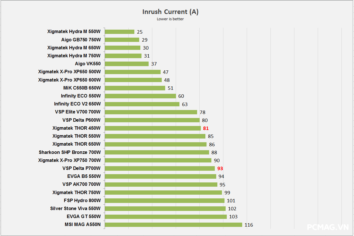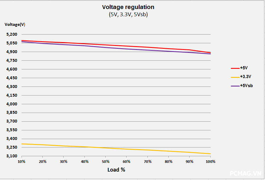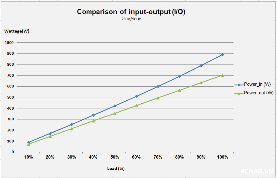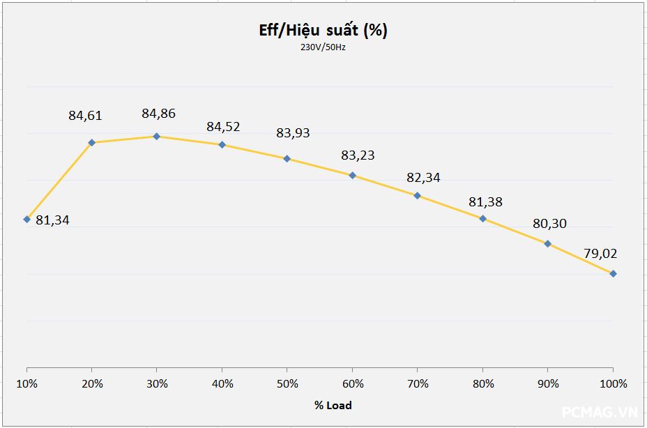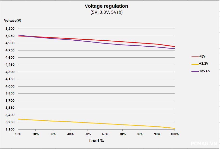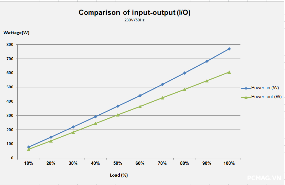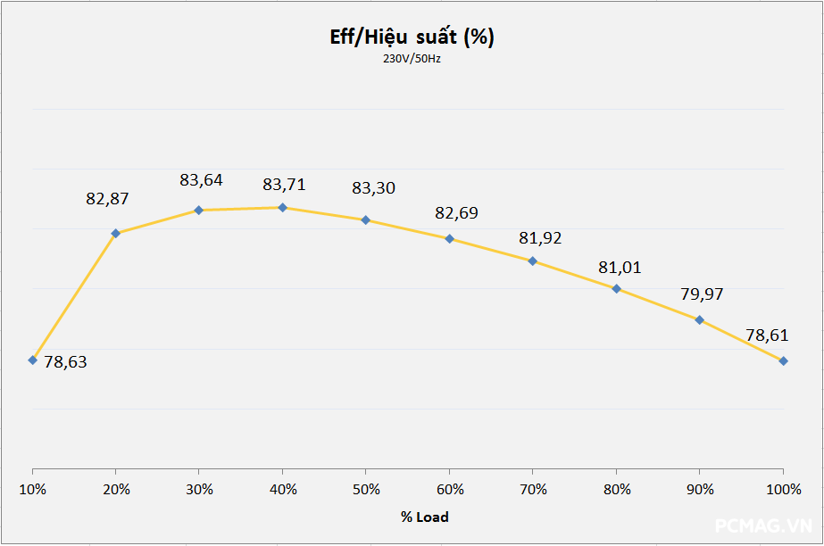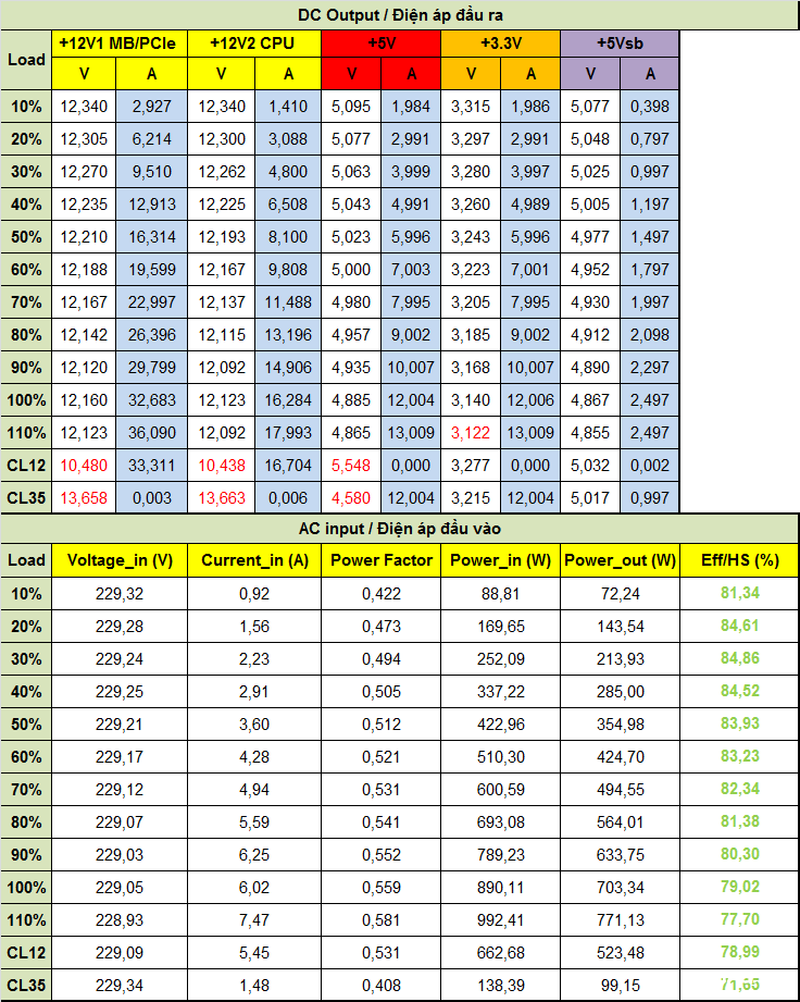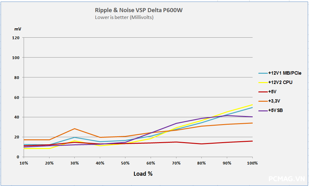 Ngoài ra, do không sử dụng thiết kế DC-to-DC, khi tải không đồng đều giữa các rail, điện áp trên P600W nhanh chóng bị lệch khỏi chuẩn ATX. Hiệu suất tối đa của cả hai nguồn đạt khoảng 83% @230Vac, đúng với thông số mà VSP công bố.