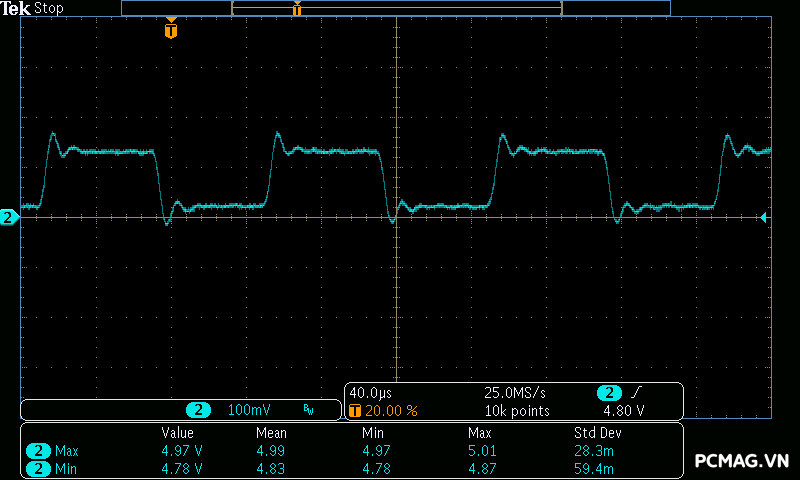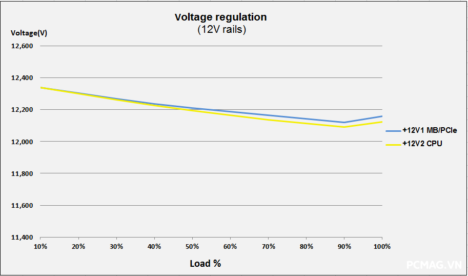 Trong quá trình thử tải, Delta P700W duy trì điện áp ổn định, nằm trong giới hạn cho phép của chuẩn ATX. Trong khi đó, P600W gặp tình trạng đường 3.3V tụt xuống còn 3.12V, vượt ra ngoài mức tiêu chuẩn.
