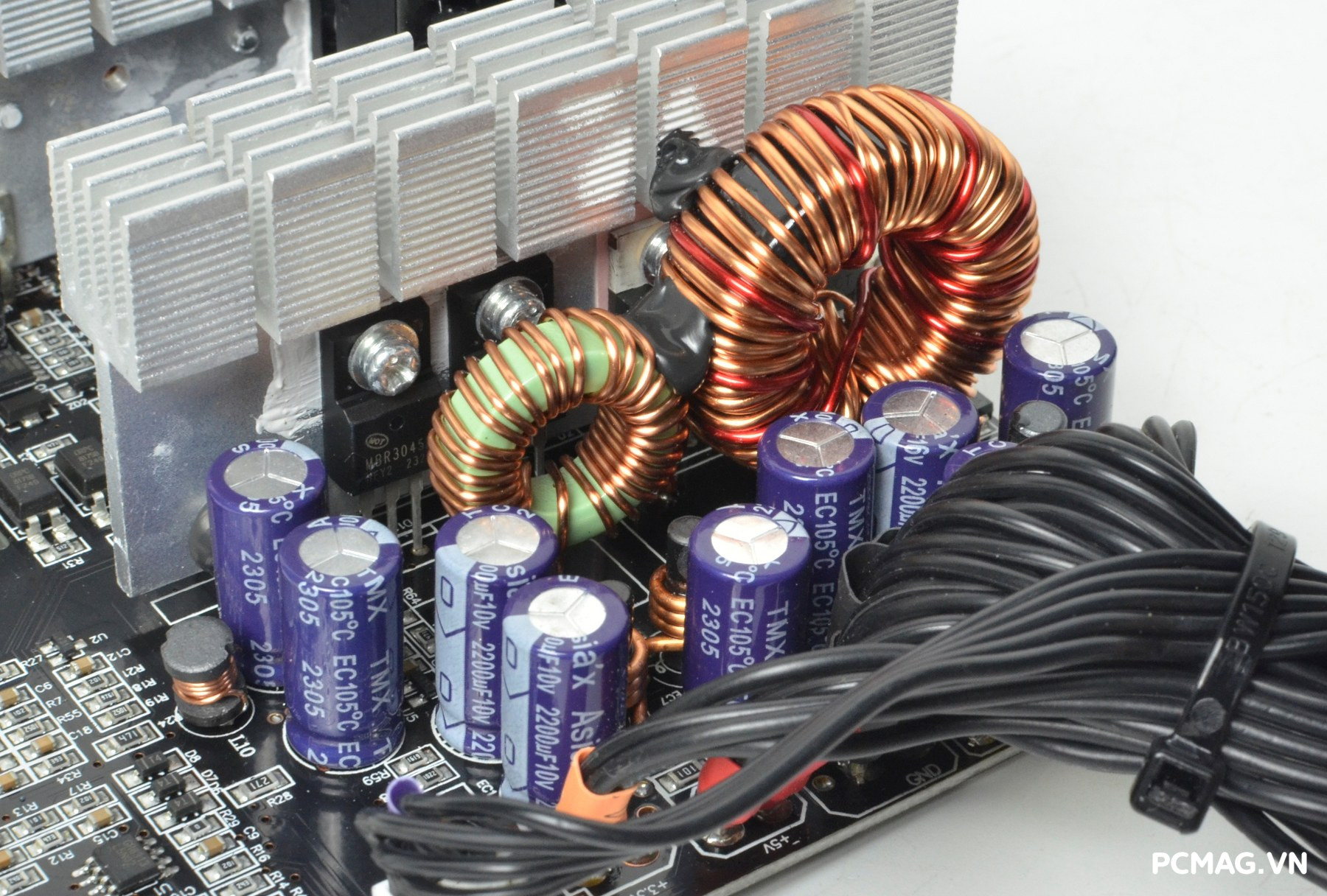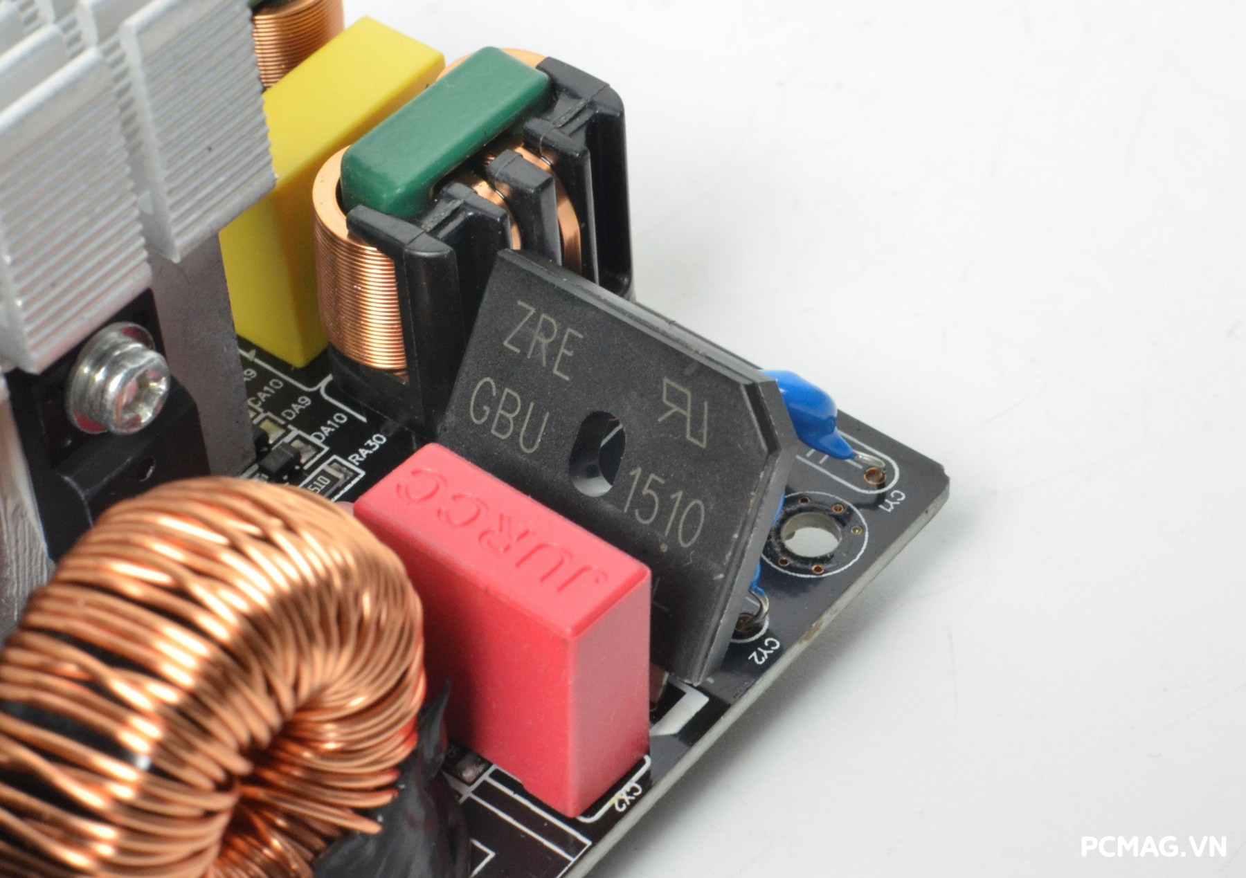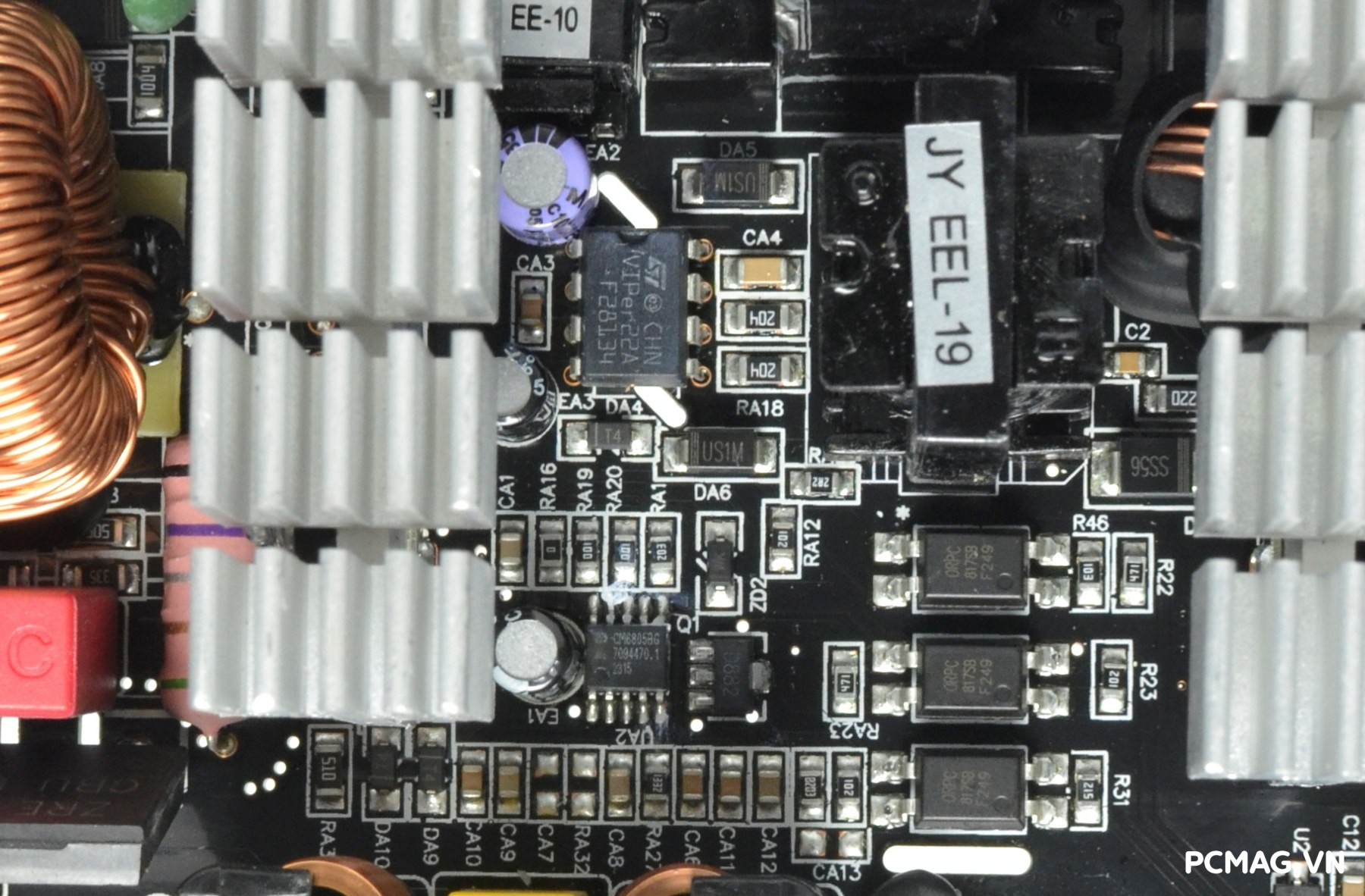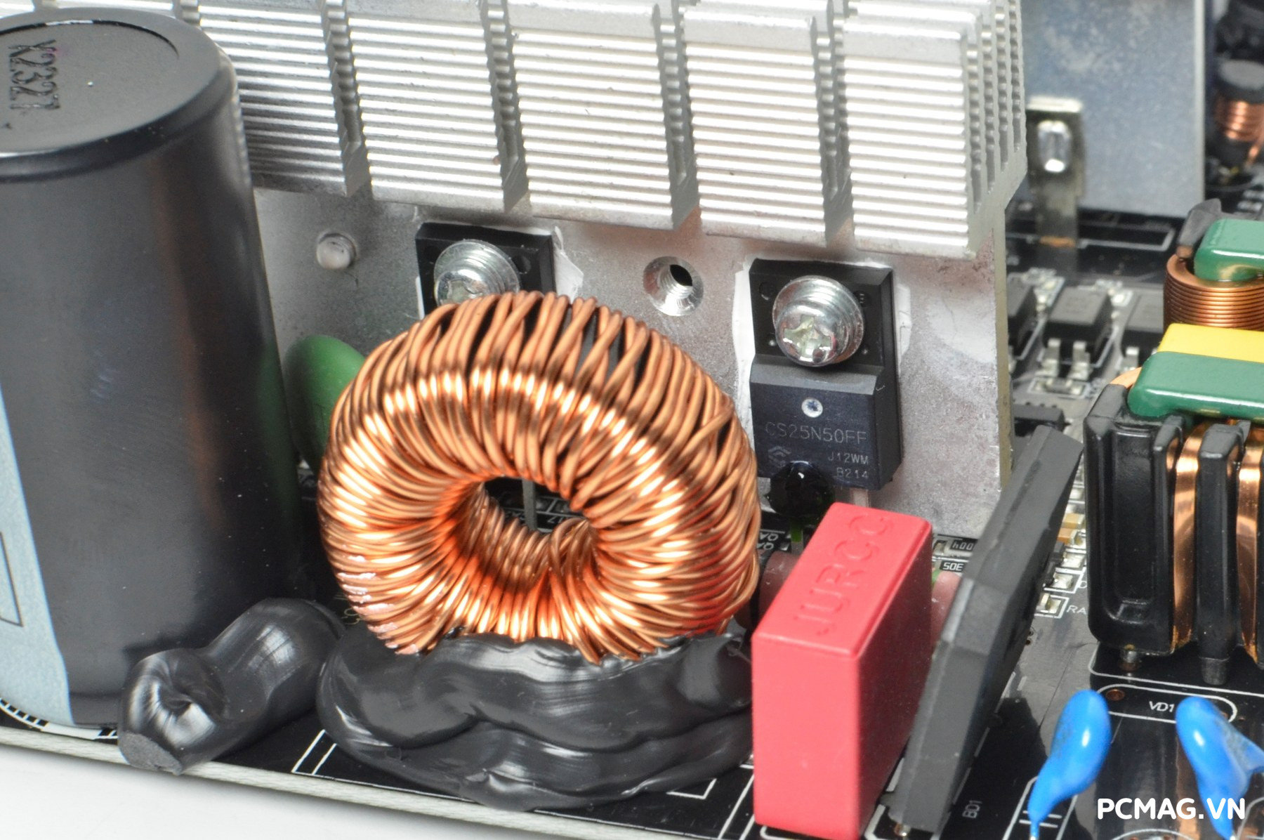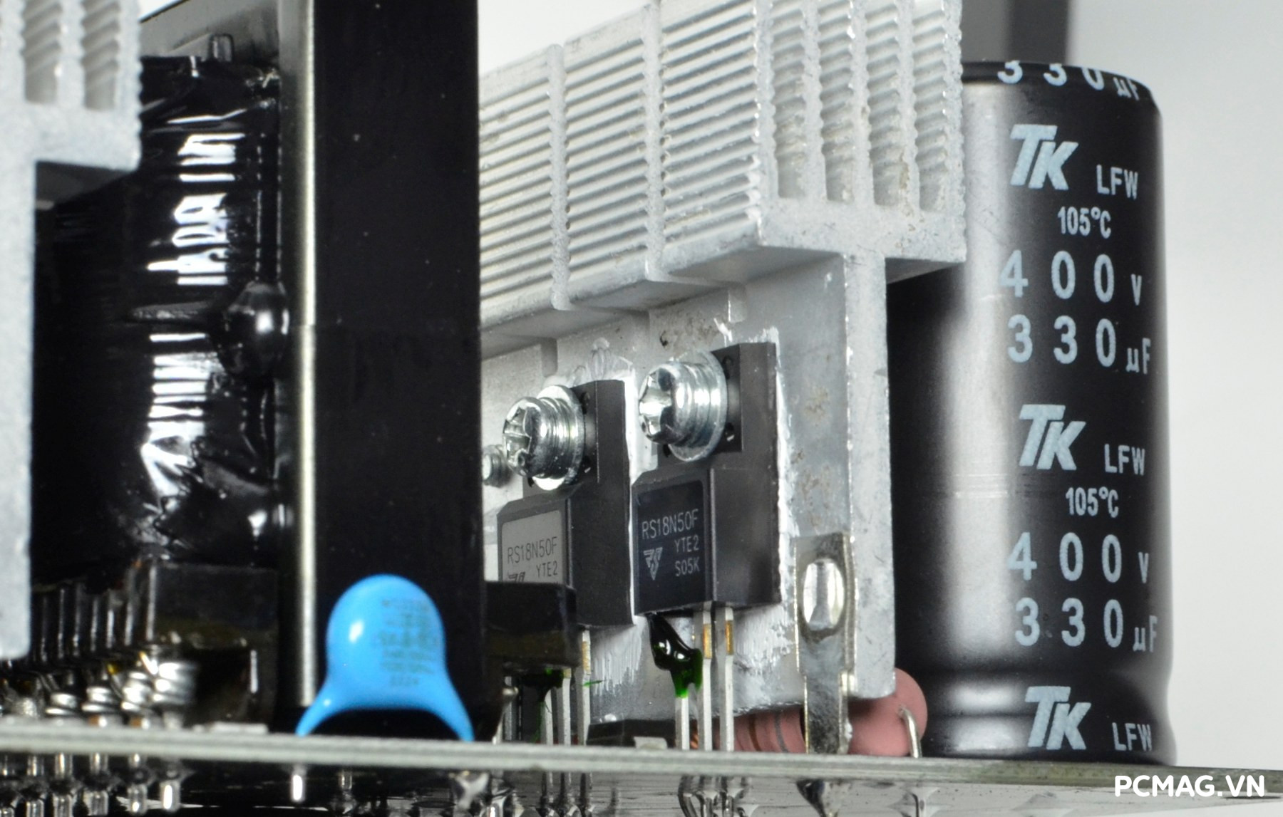 Tầng Active PFC sử dụng một Mosfet Convert Semi CS25N50FF (25A) kết hợp cùng diode xung CMPFC086G (8A). Ở tầng PWM, nguồn được trang bị cặp Mosfet Reasunos RS18N50F (18A) để đảm nhiệm quá trình chuyển mạch. Bộ điều khiển dao động Champion CM6805BG tiếp tục là giải pháp quen thuộc, thường xuất hiện trên các dòng nguồn sử dụng thiết kế Active PFC dải điện áp hẹp.