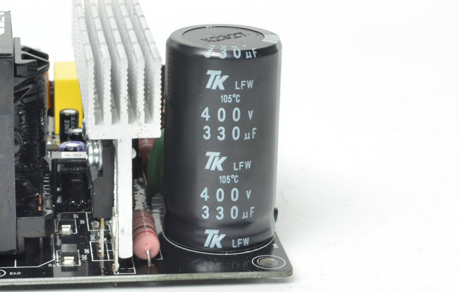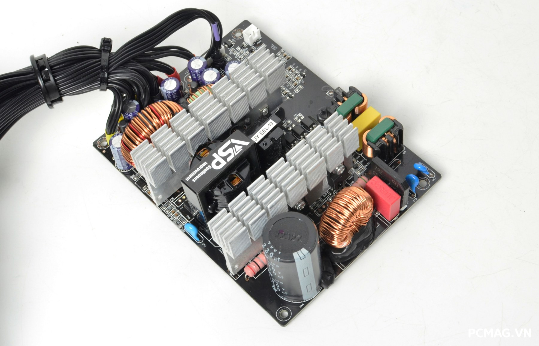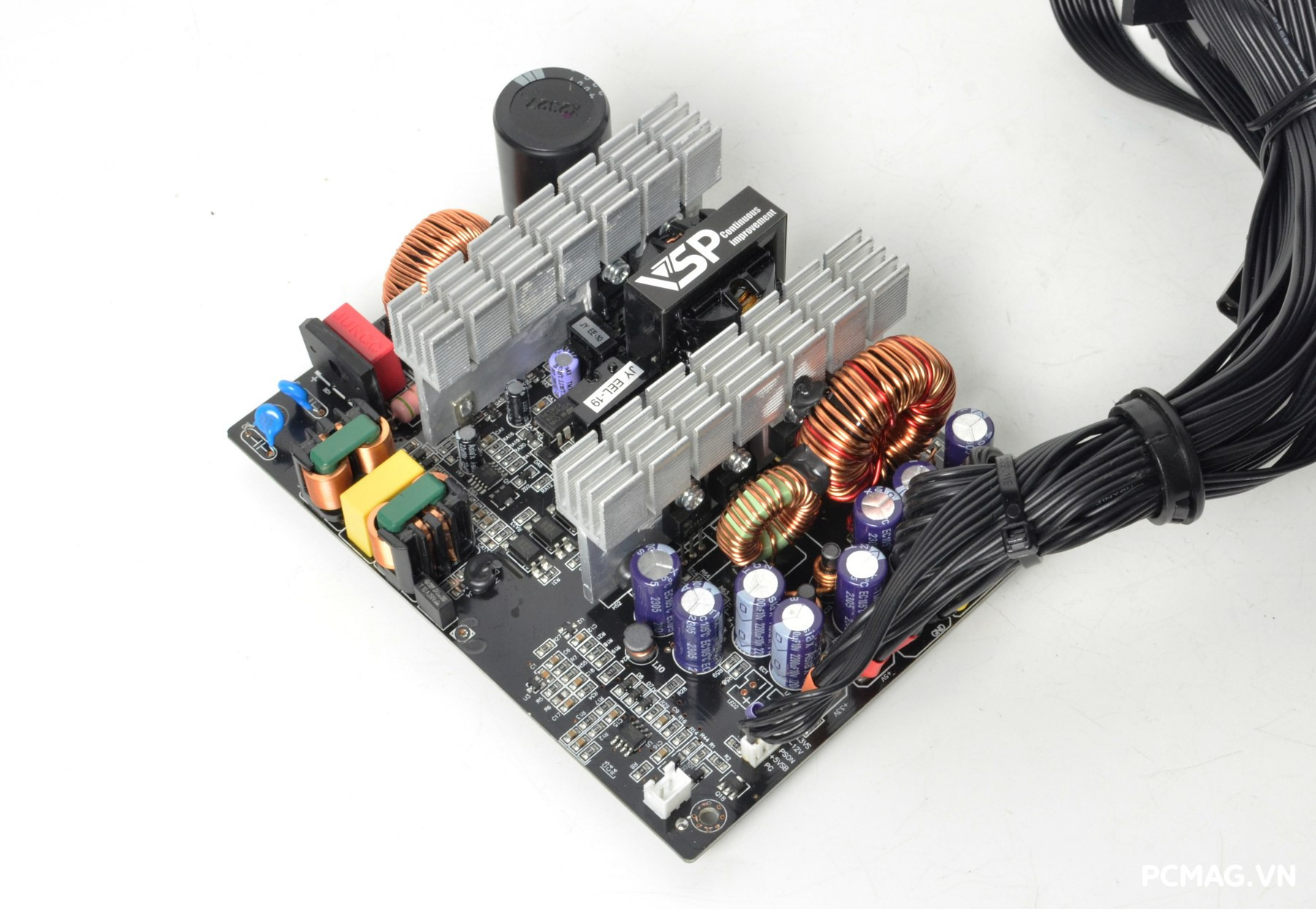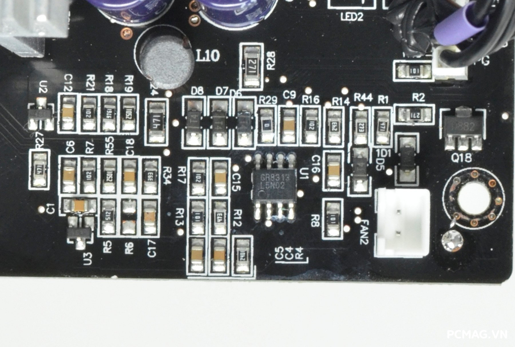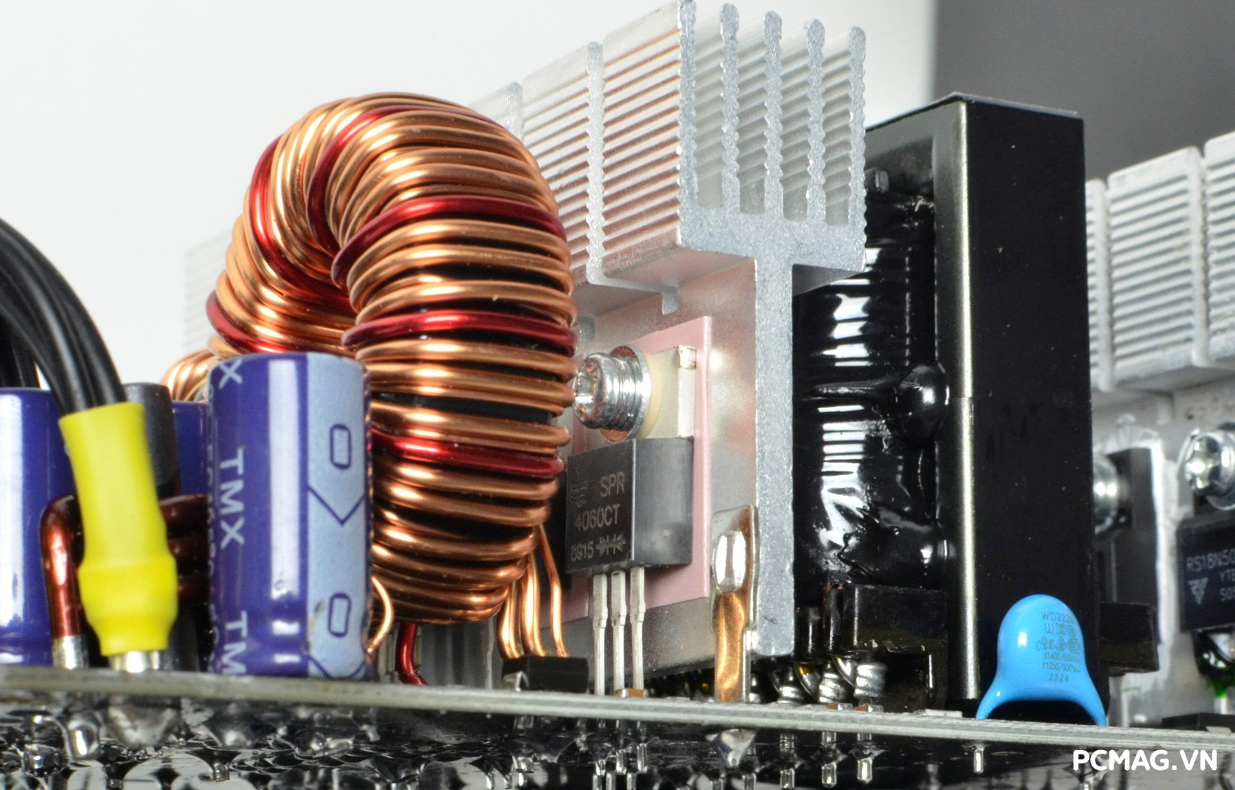 Tầng Active PFC sử dụng một Mosfet Convert Semi CS25N50FF (25A) kết hợp cùng diode xung CMPFC086G (8A). Ở tầng PWM, nguồn được trang bị cặp Mosfet Reasunos RS18N50F (18A) để đảm nhiệm quá trình chuyển mạch. Bộ điều khiển dao động Champion CM6805BG tiếp tục là giải pháp quen thuộc, thường xuất hiện trên các dòng nguồn sử dụng thiết kế Active PFC dải điện áp hẹp.