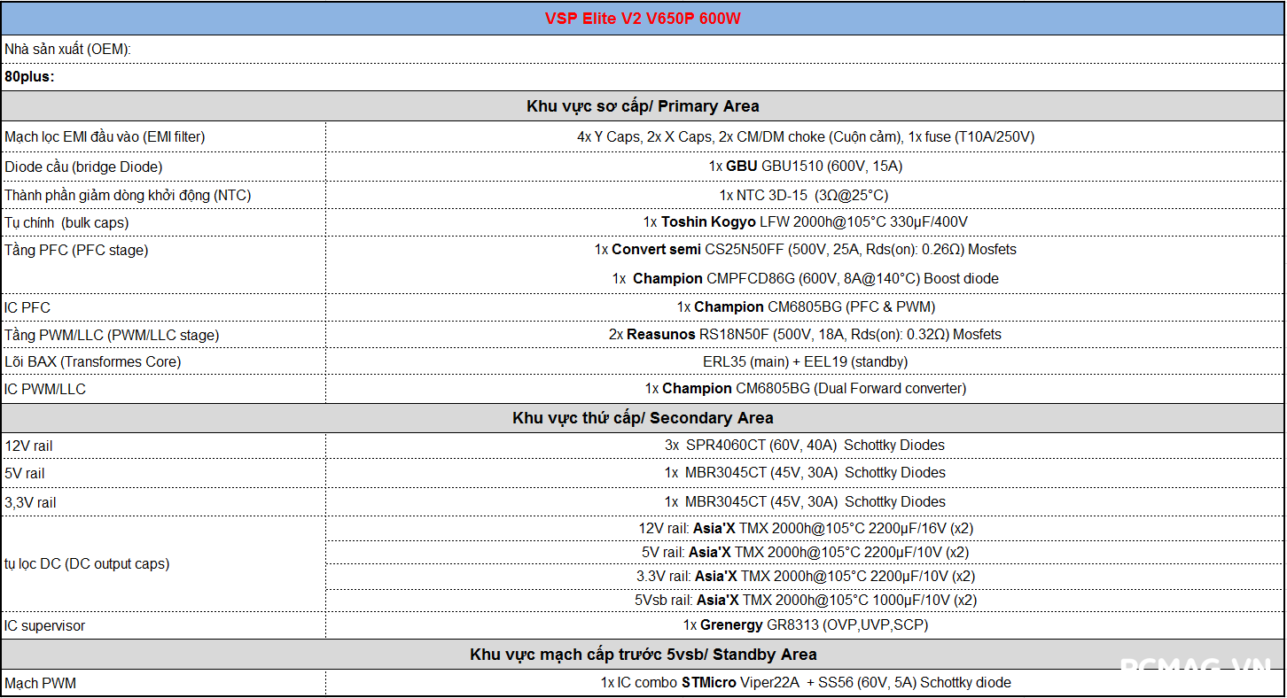 Bảng linh kiện được sử dụng trên V650P 600W: