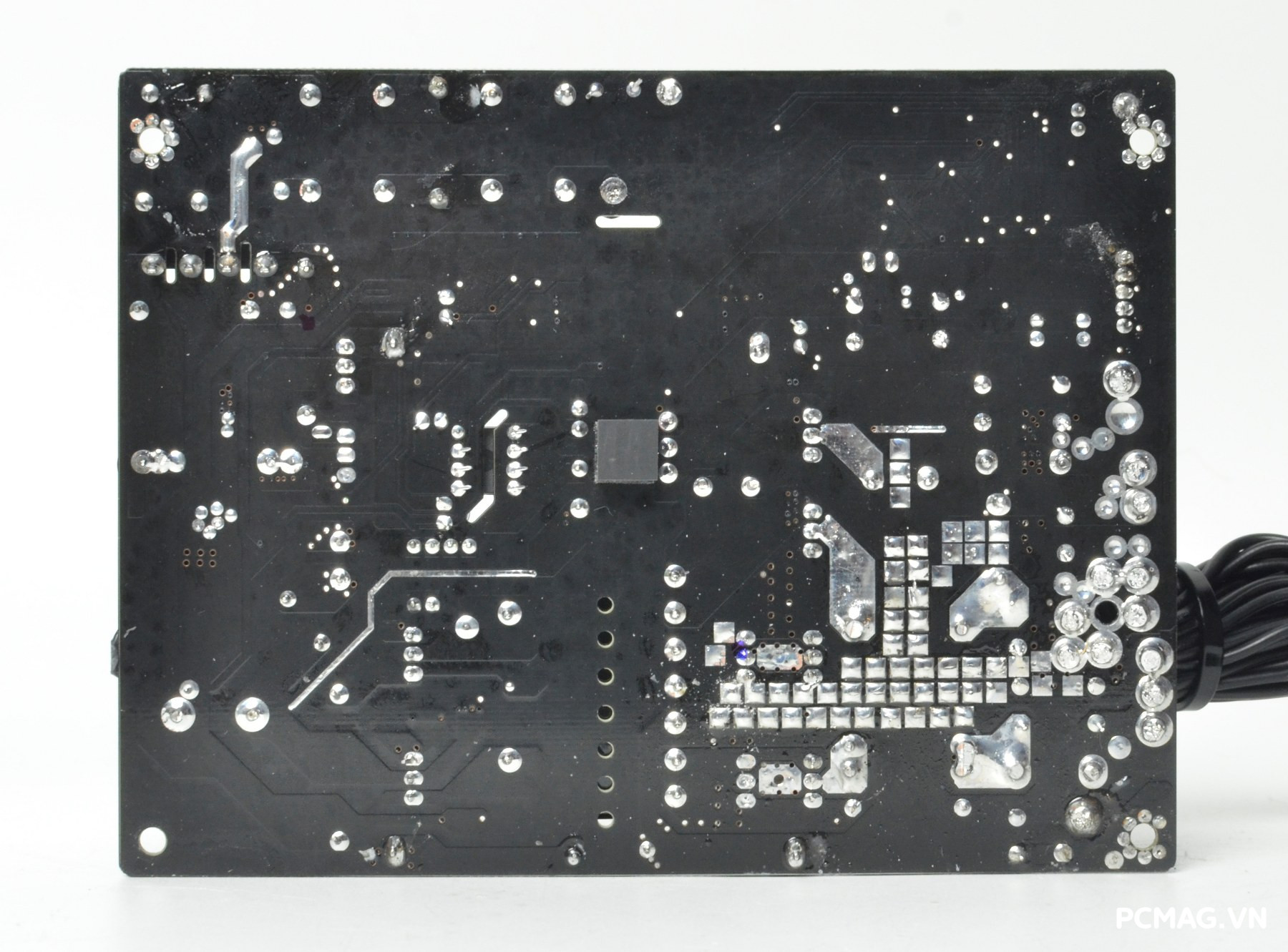 Các tụ lọc DC ở ngõ ra sử dụng linh kiện từ thương hiệu Asia’X, với mức nhiệt độ hoạt động tối đa 105°C, đáp ứng tiêu chuẩn cơ bản cho độ bền. Phần PCB của V650P 600W vẫn còn xuất hiện một số vết flux hàn chưa được làm sạch hoàn toàn, tuy nhiên các chân linh kiện đã được cắt tỉa gọn gàng, cho thấy mức độ hoàn thiện ở mức khá.