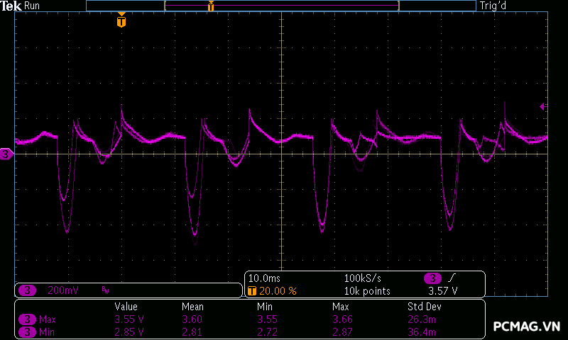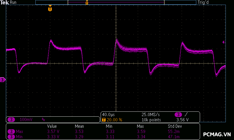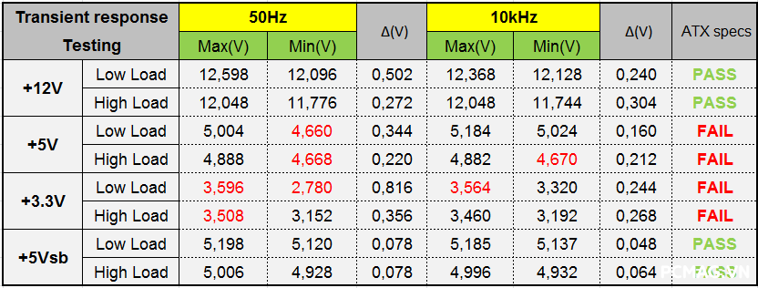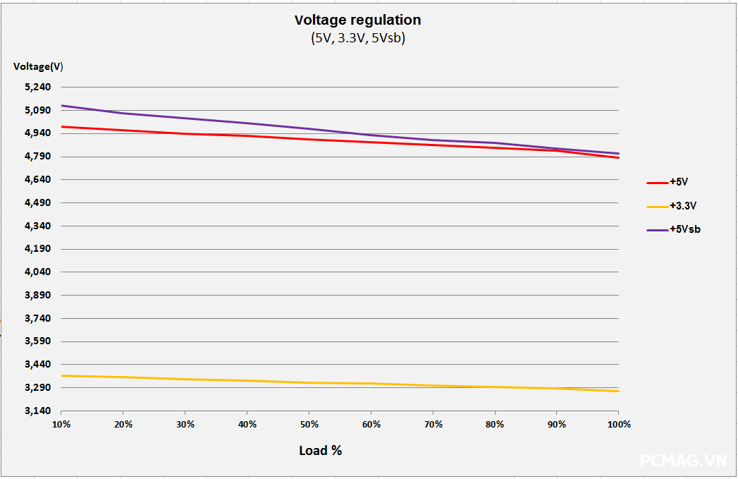 Tương tự nhiều bộ nguồn giá rẻ trong phân khúc phổ thông, V650P 600W bộc lộ hạn chế ở các đường 3.3V và 5V. Điện áp không tải ban đầu được thiết lập ở mức khá thấp, dẫn đến khi gặp tải biến thiên, điện áp sụt xuống sát ngưỡng dưới của chuẩn ATX (khoảng ~0.1V). Điều này cho thấy khả năng đáp ứng tải động ở hai rail này chưa thực sự tối ưu.