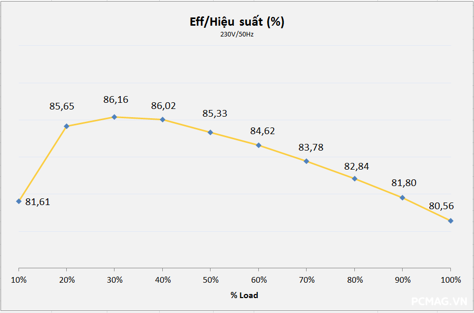 Về hiệu suất thực tế, nguồn đạt khoảng 86% @230Vac, cao hơn mức công bố, cho thấy hiệu quả hoạt động khá tốt trong phân khúc.