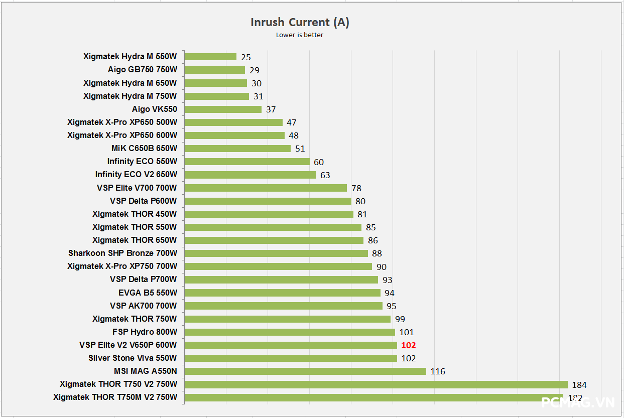Dòng khởi động của V650P 600W ở mức khá cao so với các sản phẩm cùng phân khúc, ghi nhận khoảng 102A. Điều này có thể ảnh hưởng đến hệ thống điện khi bật nguồn, đặc biệt trong môi trường sử dụng nhiều thiết bị cùng lúc.