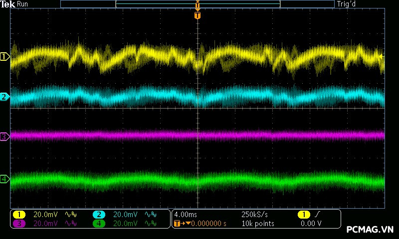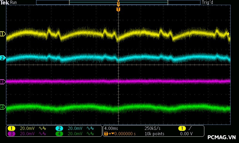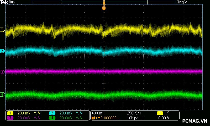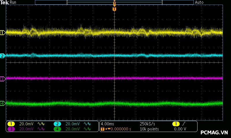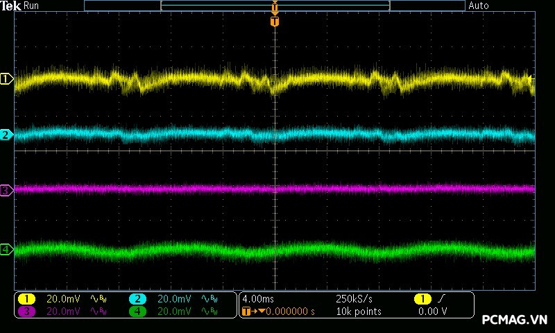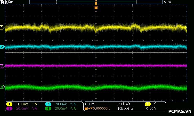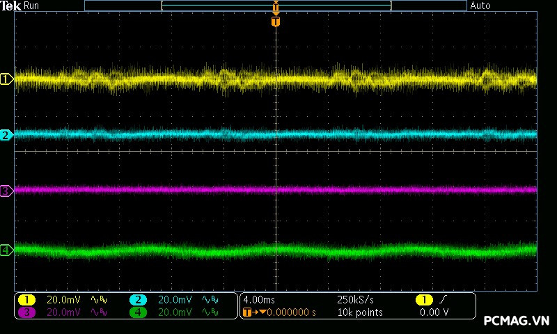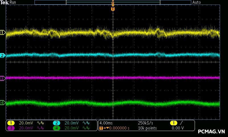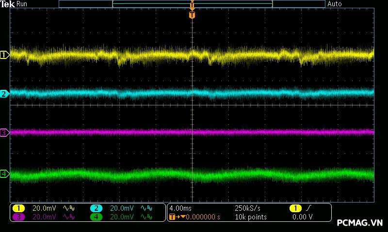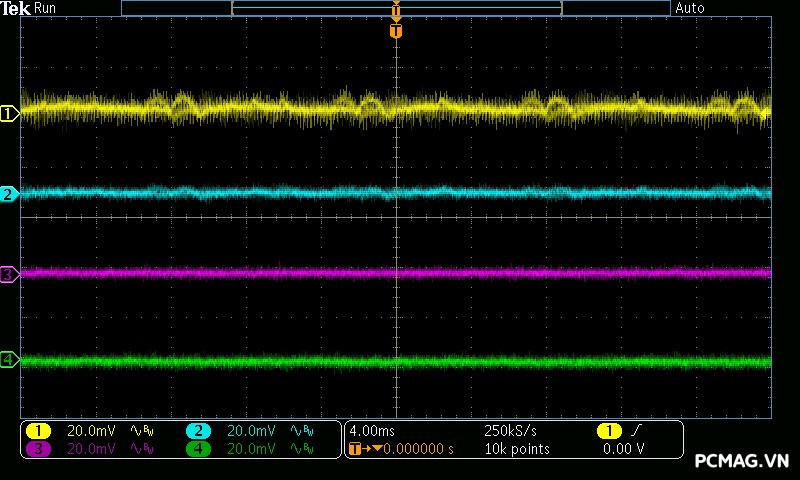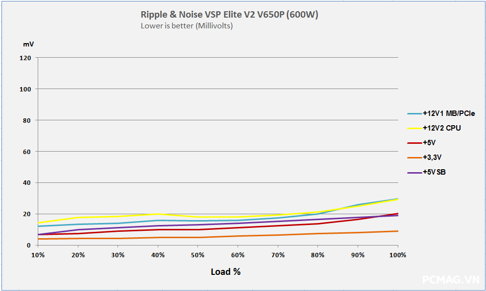 V650P 600W cho thấy mức ripple & noise được kiểm soát khá tốt trong quá trình thử nghiệm. Ở đường 12V, độ nhiễu tối đa ghi nhận khoảng 30mV, trong khi các đường điện còn lại đều duy trì ở mức dưới 30mV, nằm trong giới hạn an toàn theo chuẩn ATX.