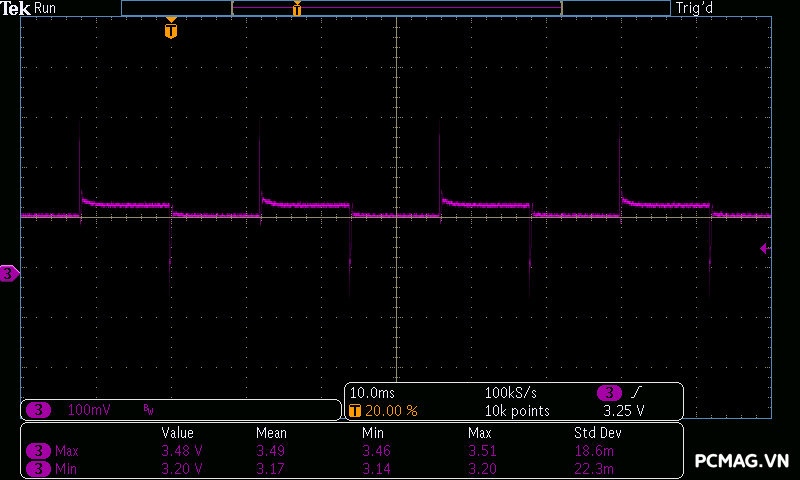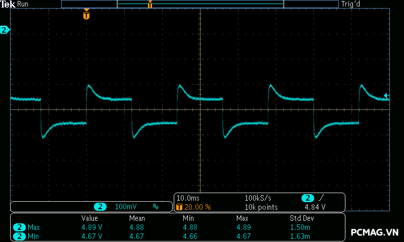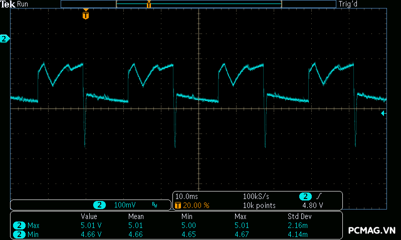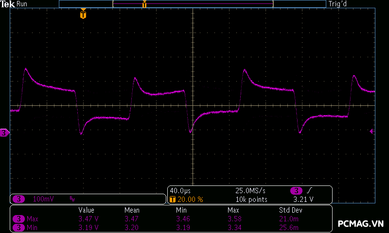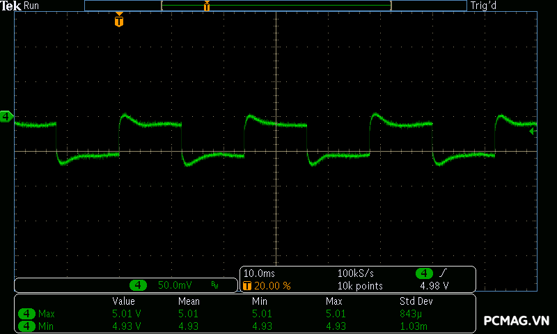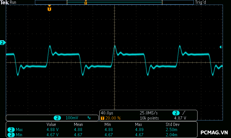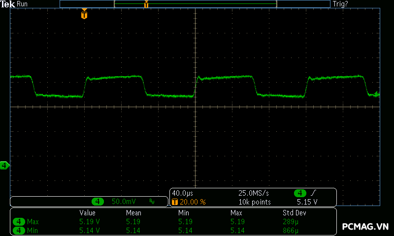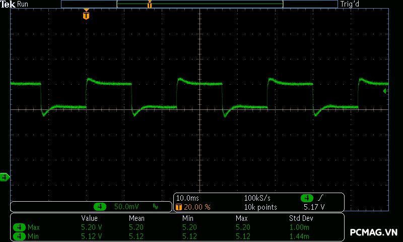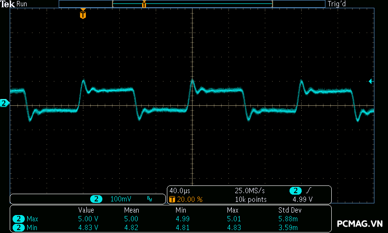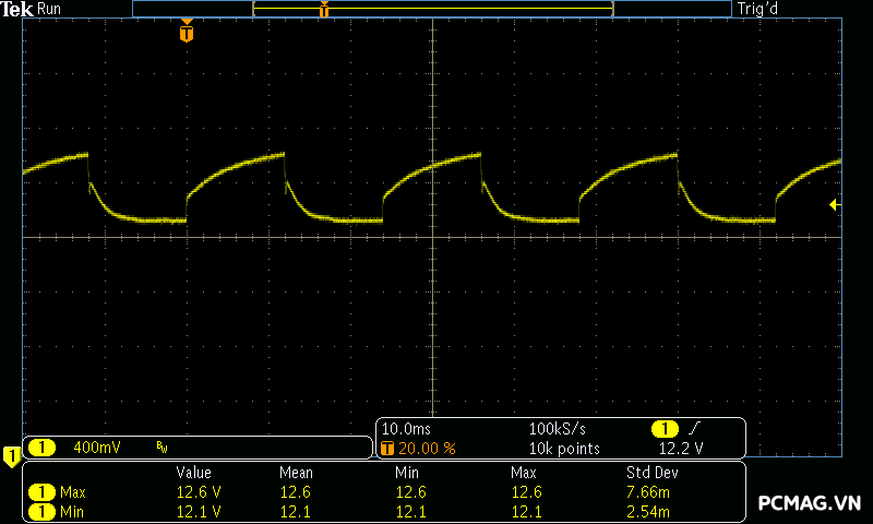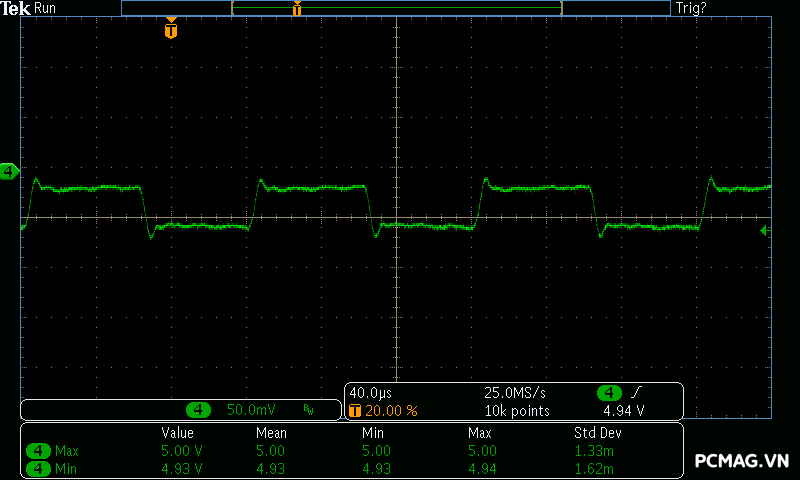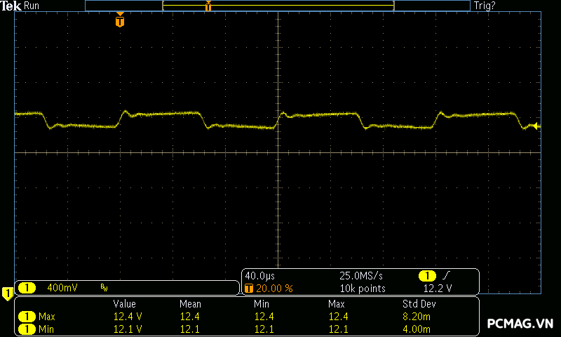 V650P 600W cho thấy mức ripple & noise được kiểm soát khá tốt trong quá trình thử nghiệm. Ở đường 12V, độ nhiễu tối đa ghi nhận khoảng 30mV, trong khi các đường điện còn lại đều duy trì ở mức dưới 30mV, nằm trong giới hạn an toàn theo chuẩn ATX.