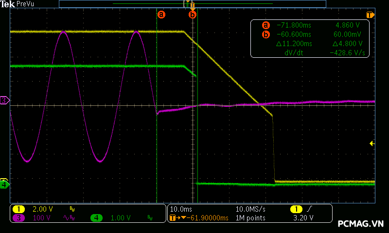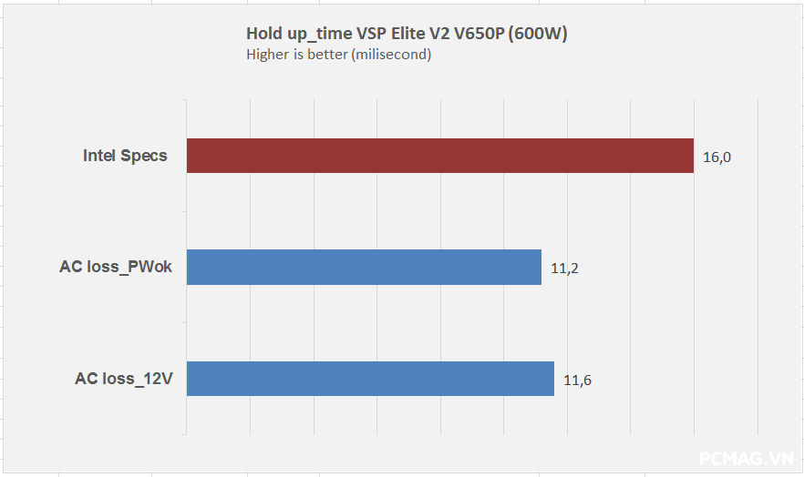 V650P 600W có thời gian lưu điện khoảng 11ms, thấp hơn so với mức tối thiểu 16ms theo tiêu chuẩn ATX. Điều này cho thấy khả năng duy trì điện áp khi mất điện đột ngột chưa thực sự đạt chuẩn, có thể ảnh hưởng trong một số tình huống nguồn điện không ổn định.