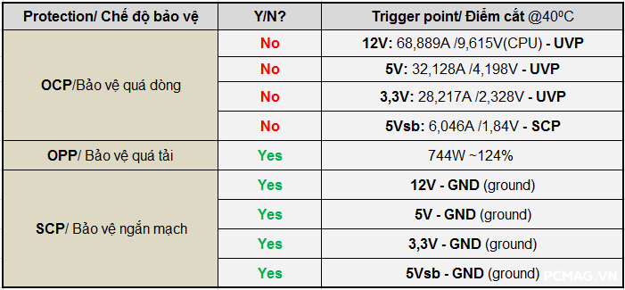 Do không được trang bị IC giám sát hỗ trợ OCP (bảo vệ quá dòng), nên khi xảy ra tình trạng quá tải, nguồn sẽ kích hoạt UVP (bảo vệ thấp áp) để đảm bảo an toàn cho hệ thống. Bên cạnh đó, các cơ chế bảo vệ khác như OPP (quá công suất) và SCP (ngắn mạch) trên V650P 600W vẫn hoạt động hiệu quả và ổn định.