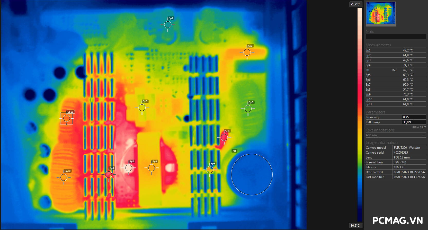 Trong quá trình vận hành, nhiệt độ tối đa ghi nhận dao động khoảng ~90°C, với điểm nóng tập trung tại khu vực ngõ ra biến áp chính và đầu vào các diode chỉnh lưu.