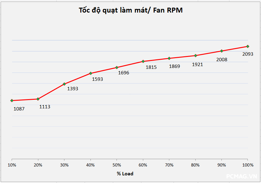 Quạt làm mát hoạt động theo đường cong tuyến tính theo nhiệt độ, tăng dần tốc độ khi tải và nhiệt tăng, với mức tối đa khoảng 2100 RPM, đảm bảo khả năng tản nhiệt ổn định cho toàn bộ hệ thống.