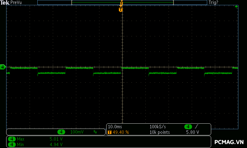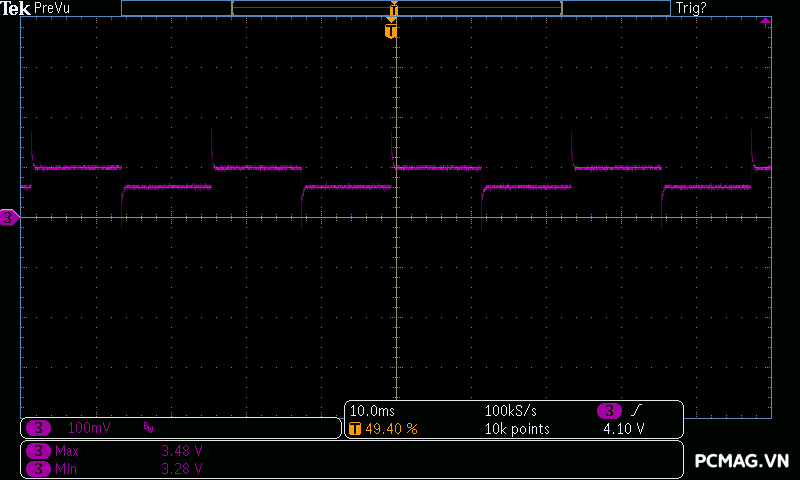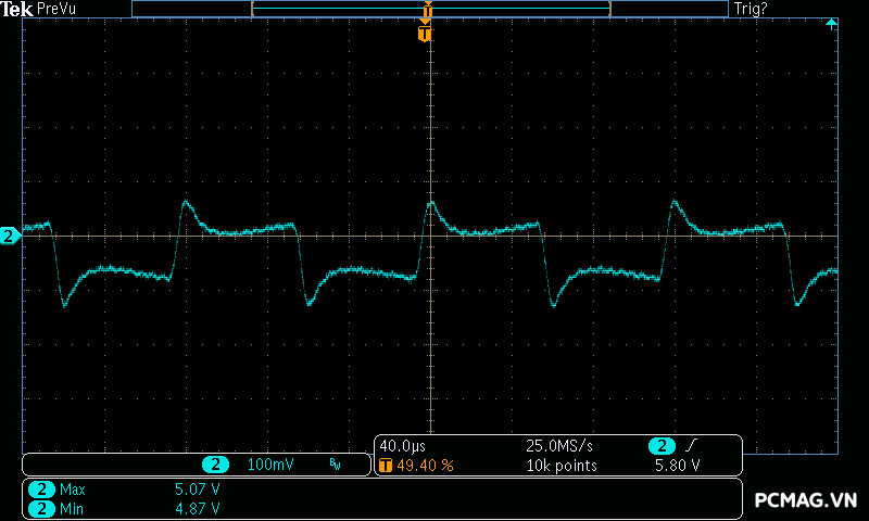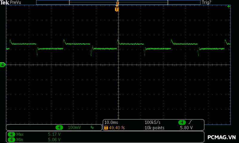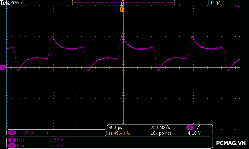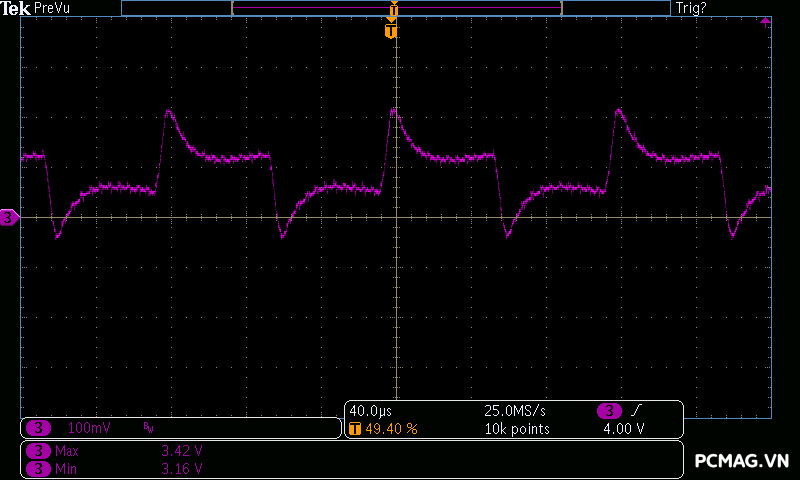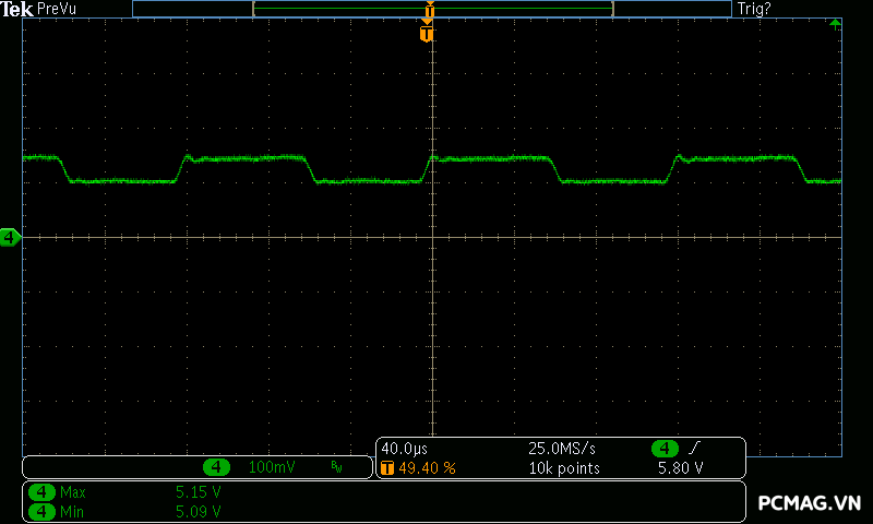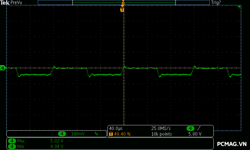 Trong bài test tải biến thiên, tương tự nhiều mẫu nguồn phổ thông khác trong cùng phân khúc, Elite VS650D V4 vẫn gặp giới hạn nhẹ ở đường 3.3V. Tuy nhiên mức sai lệch chỉ khoảng 0.03V, tức rất sát ngưỡng tiêu chuẩn cho phép và không phải vấn đề đáng lo ngại trong điều kiện sử dụng thực tế.