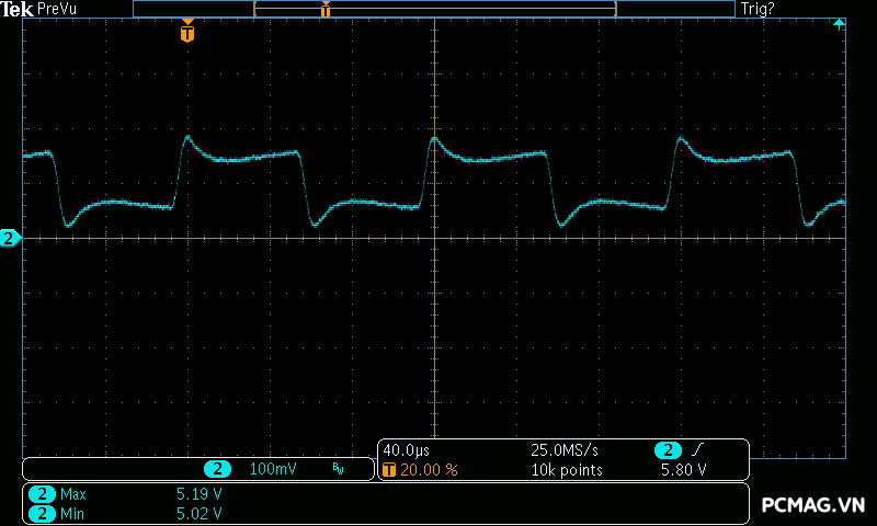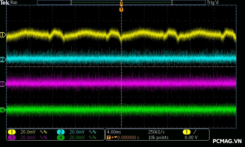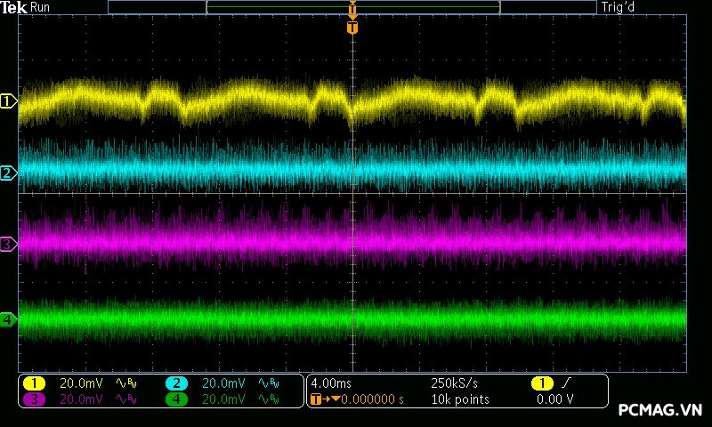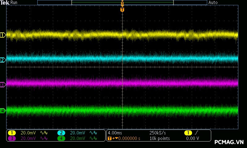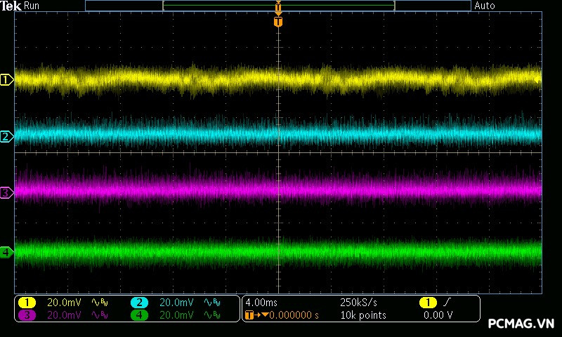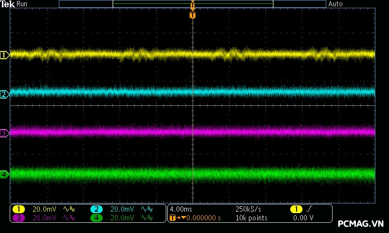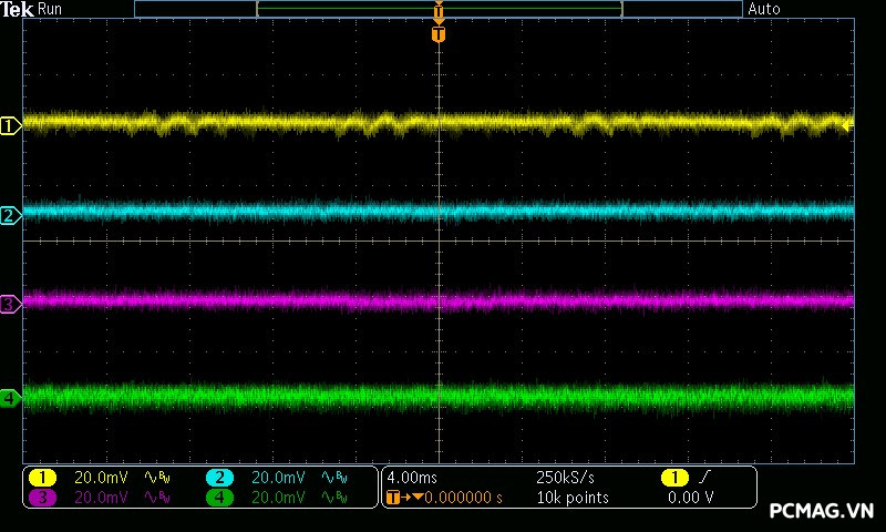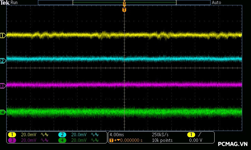Mức Ripple & Noise của Elite VS650D V4 được ghi nhận ở mức khá trong phân khúc, với giá trị tối đa dao động khoảng 40mV trên cả bốn đường điện chính. Kết quả này vẫn nằm trong giới hạn tiêu chuẩn ATX cho phép, đảm bảo độ ổn định điện áp khi hệ thống hoạt động.